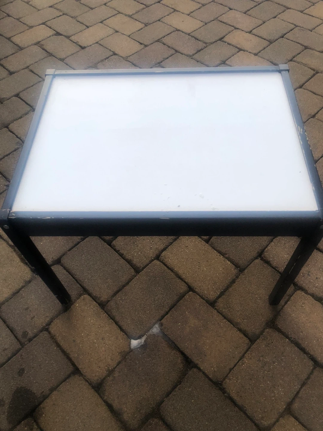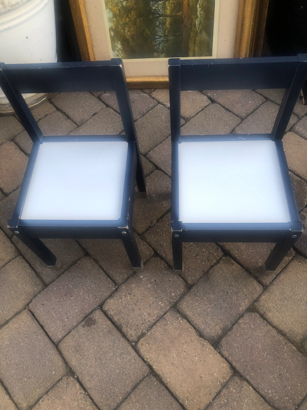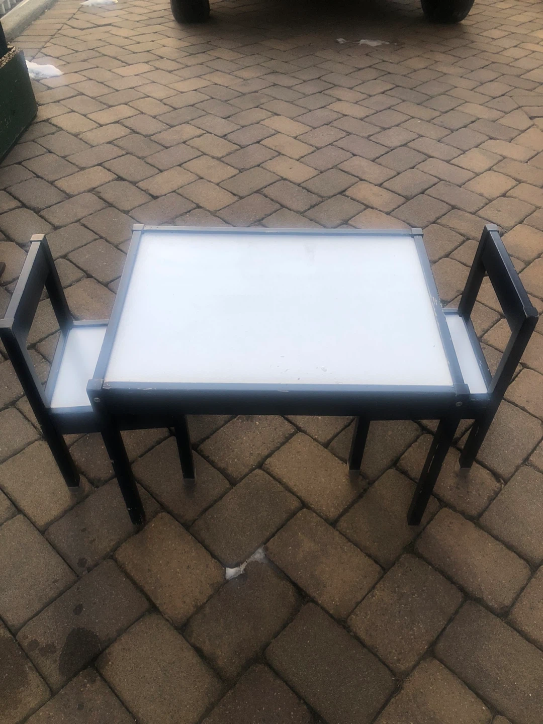 This is a kids' table and two chairs set. The table and chair frames are dark gray. The seating and table surface are white. It's a sturdy set perfect for playtime!