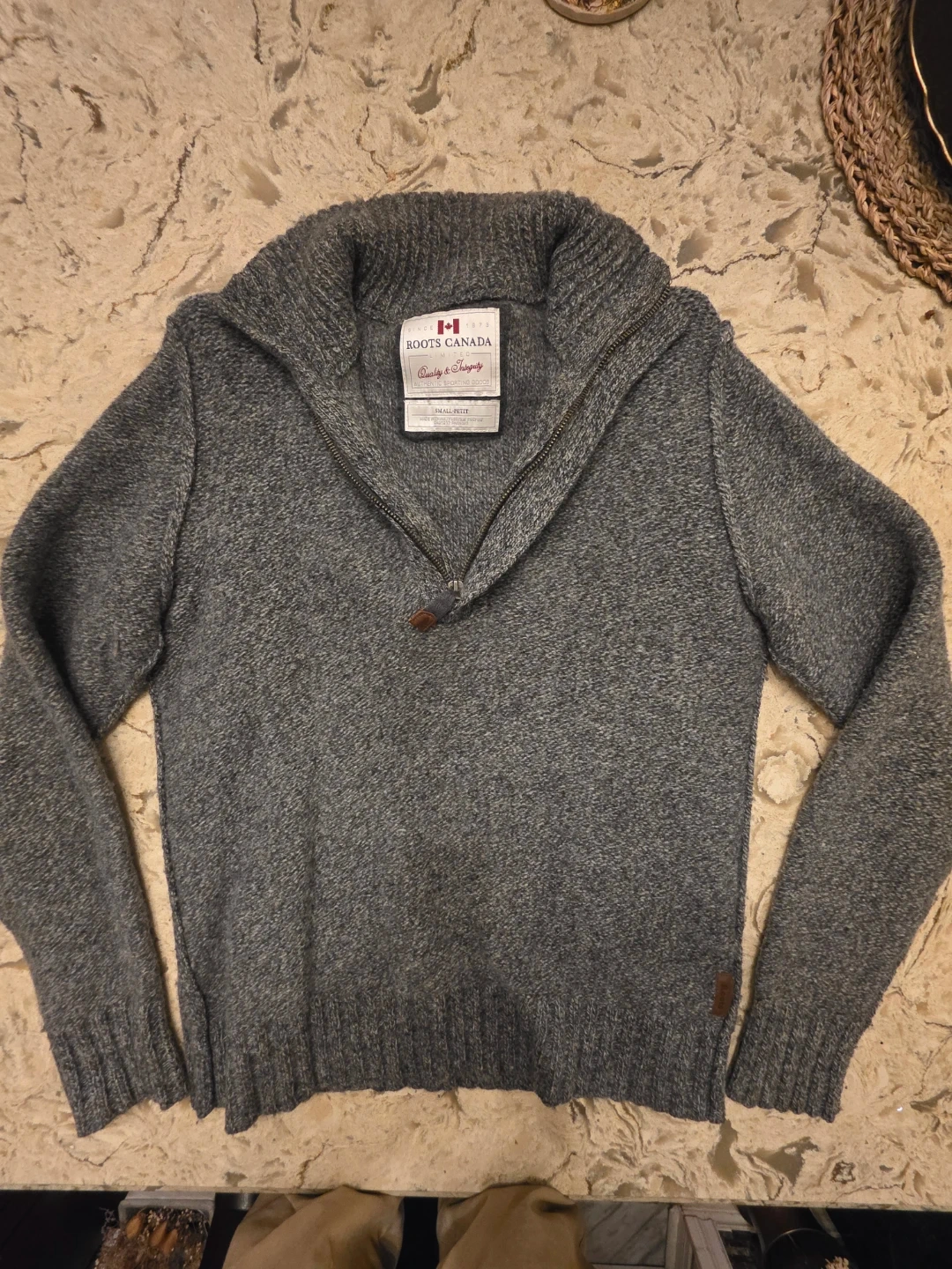 Here's a cozy Roots Canada sweater in size small! It's a lovely grey colour and made of 100% lambswool. Perfect for staying warm on chilly days