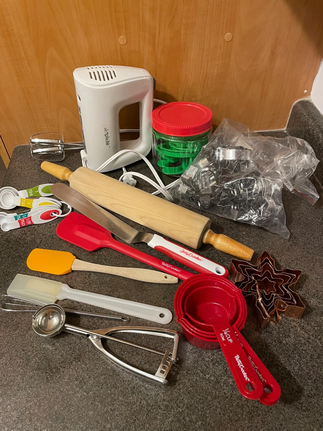 This set includes a white hand mixer with two beaters. It also comes with a wooden rolling pin, assorted spatulas, measuring cups and spoons, a cookie scoop, and various cookie cutters. Pick up only - downtown