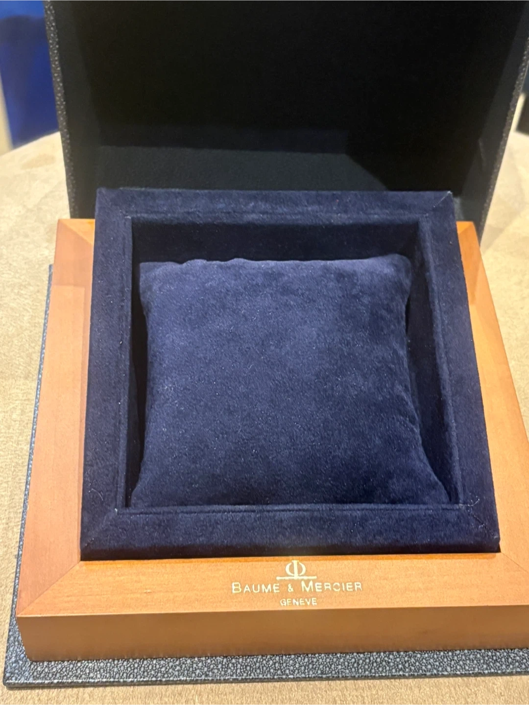 Original Baume & Mercier watch box from Geneva. Includes velvet cushion insert. Outer box is textured grey with gold embossed logo. Wood interior frame.