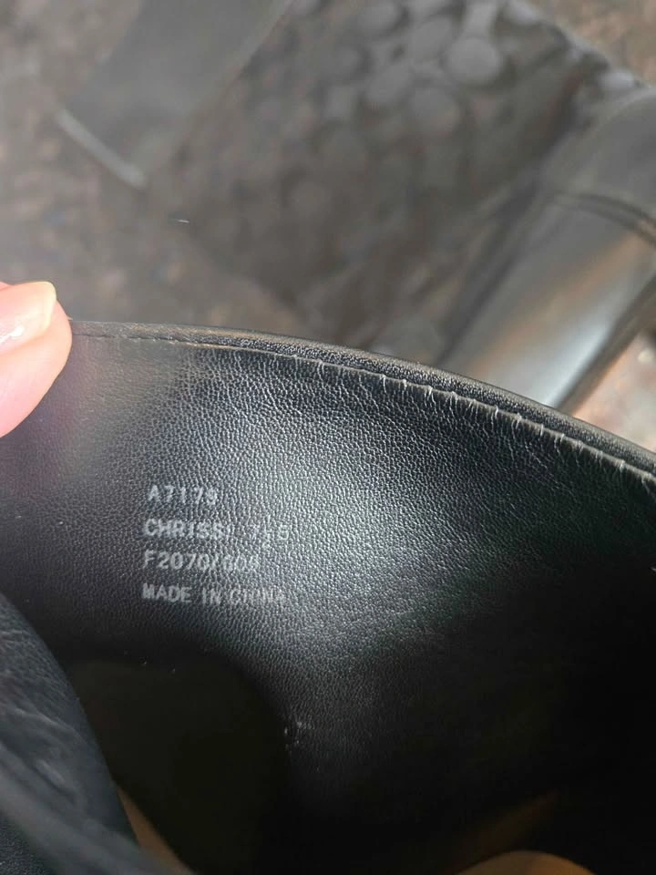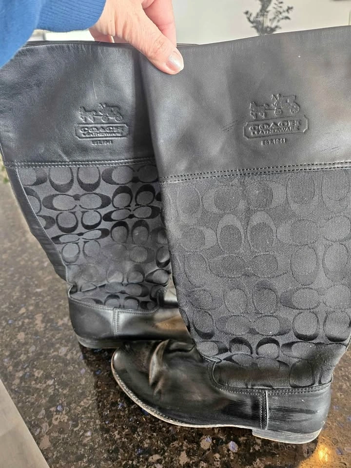 These are gorgeous Coach knee-high boots, size 7.5. They slide on easily as they do not have zippers. There is normal wear on the soles, but no scratches. The picture shows the boot wet from dusting. Located in Huntington Hills NW.