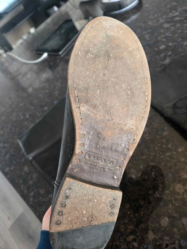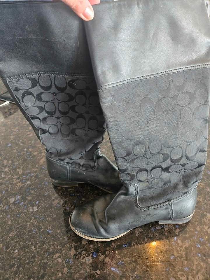 These are gorgeous Coach knee-high boots, size 7.5. They slide on easily as they do not have zippers. There is normal wear on the soles, but no scratches. The picture shows the boot wet from dusting. Located in Huntington Hills NW.