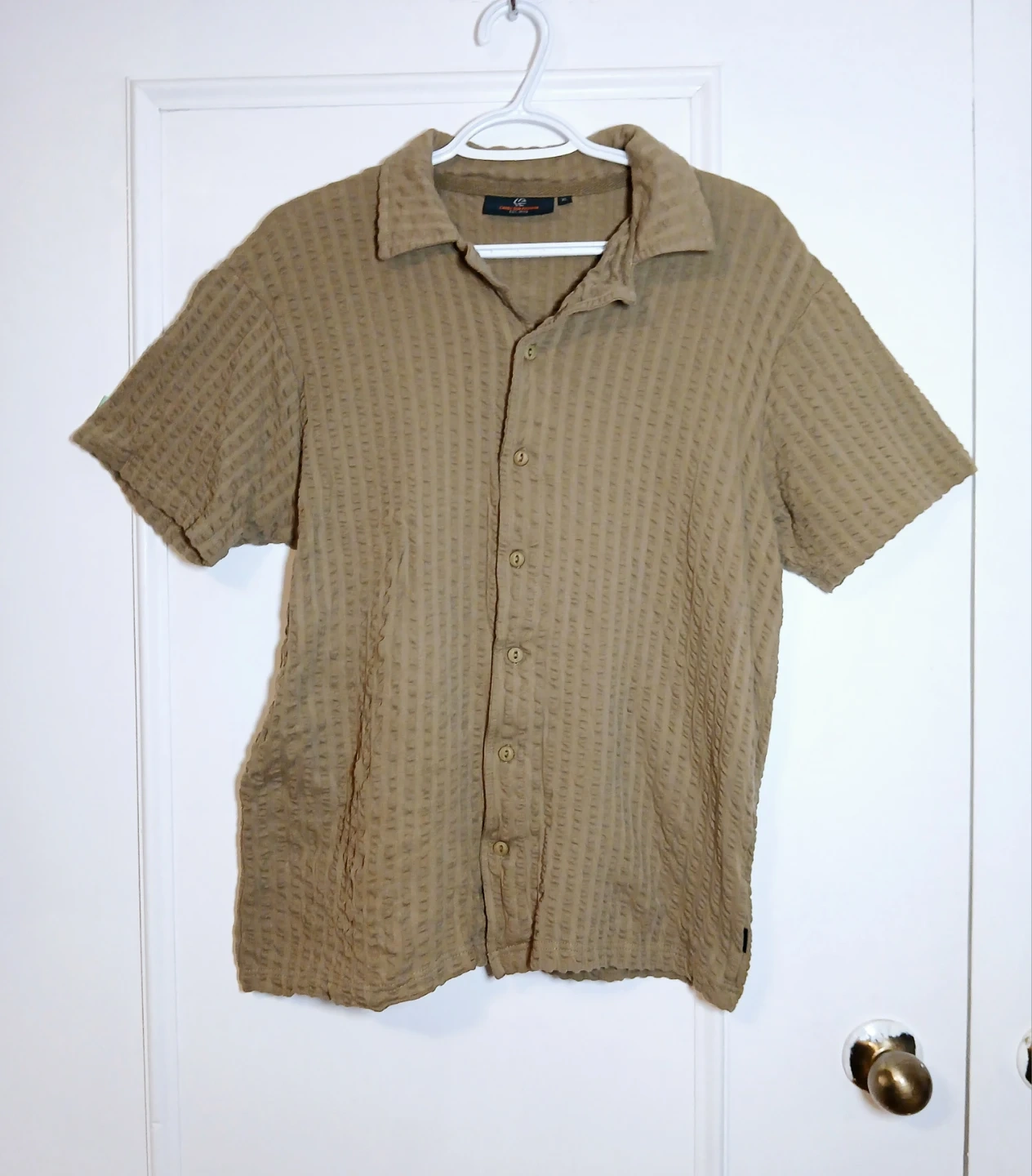 This men's short sleeve button-up shirt with a unique textured pattern. 100% cotton. Size XL. Available for pick up in Meadowvale area, closest intersection Brittania and Glen Erin