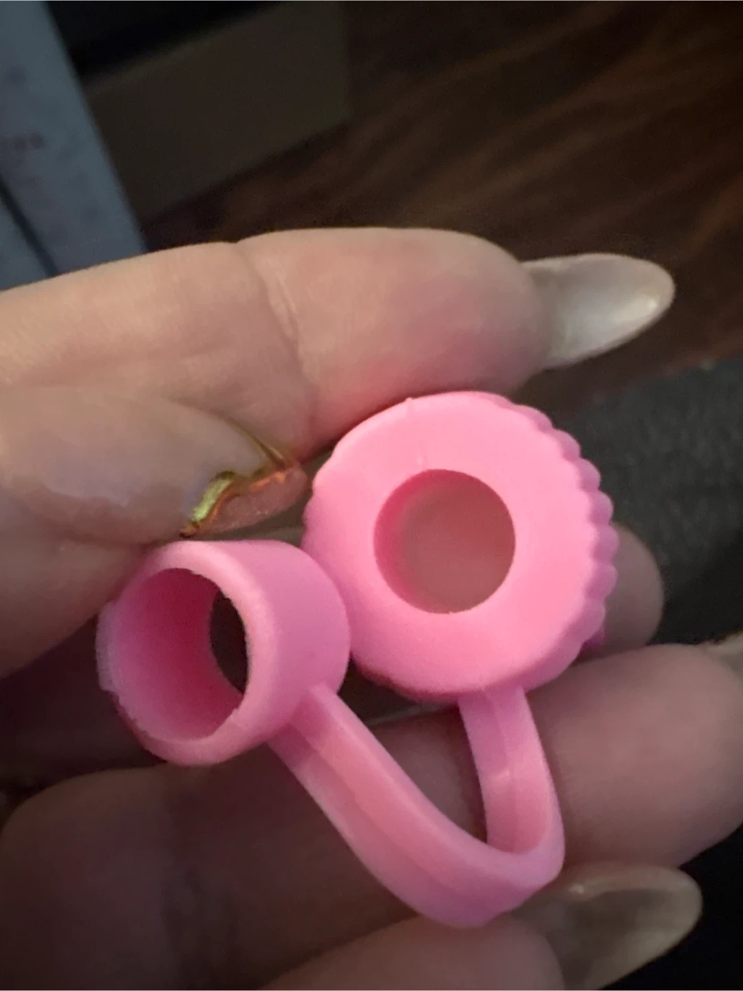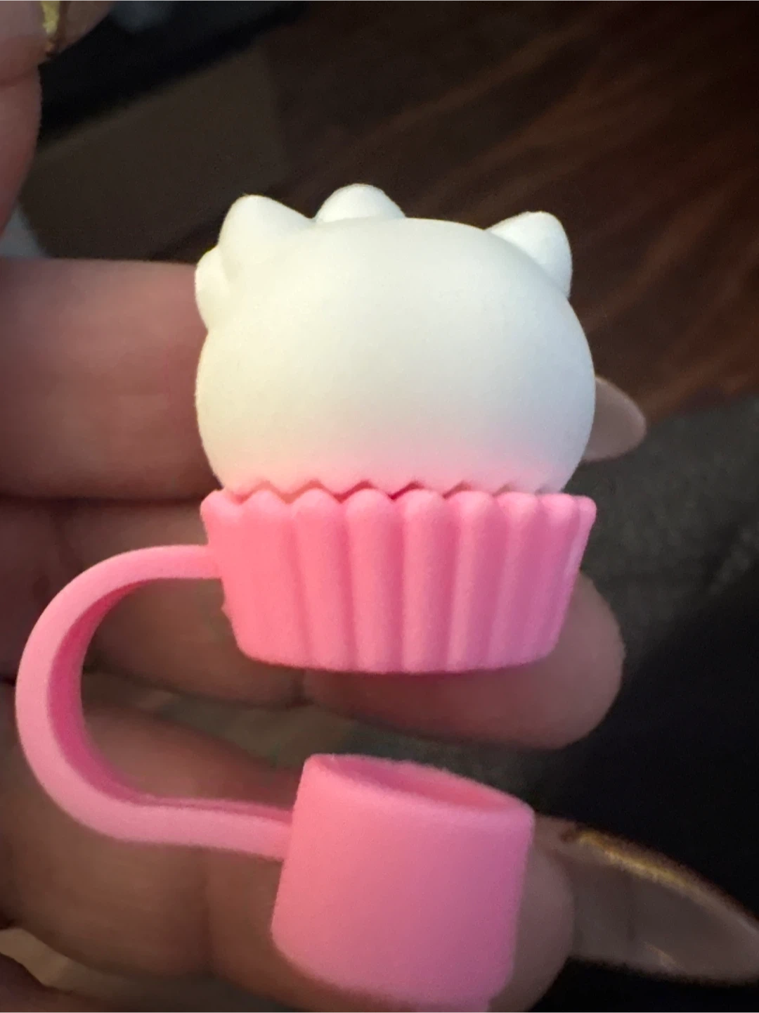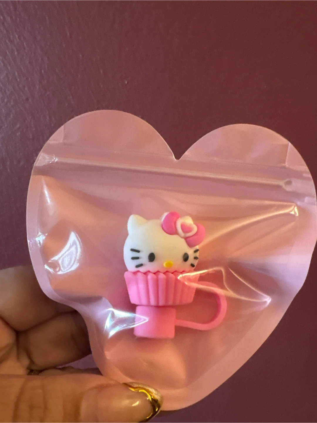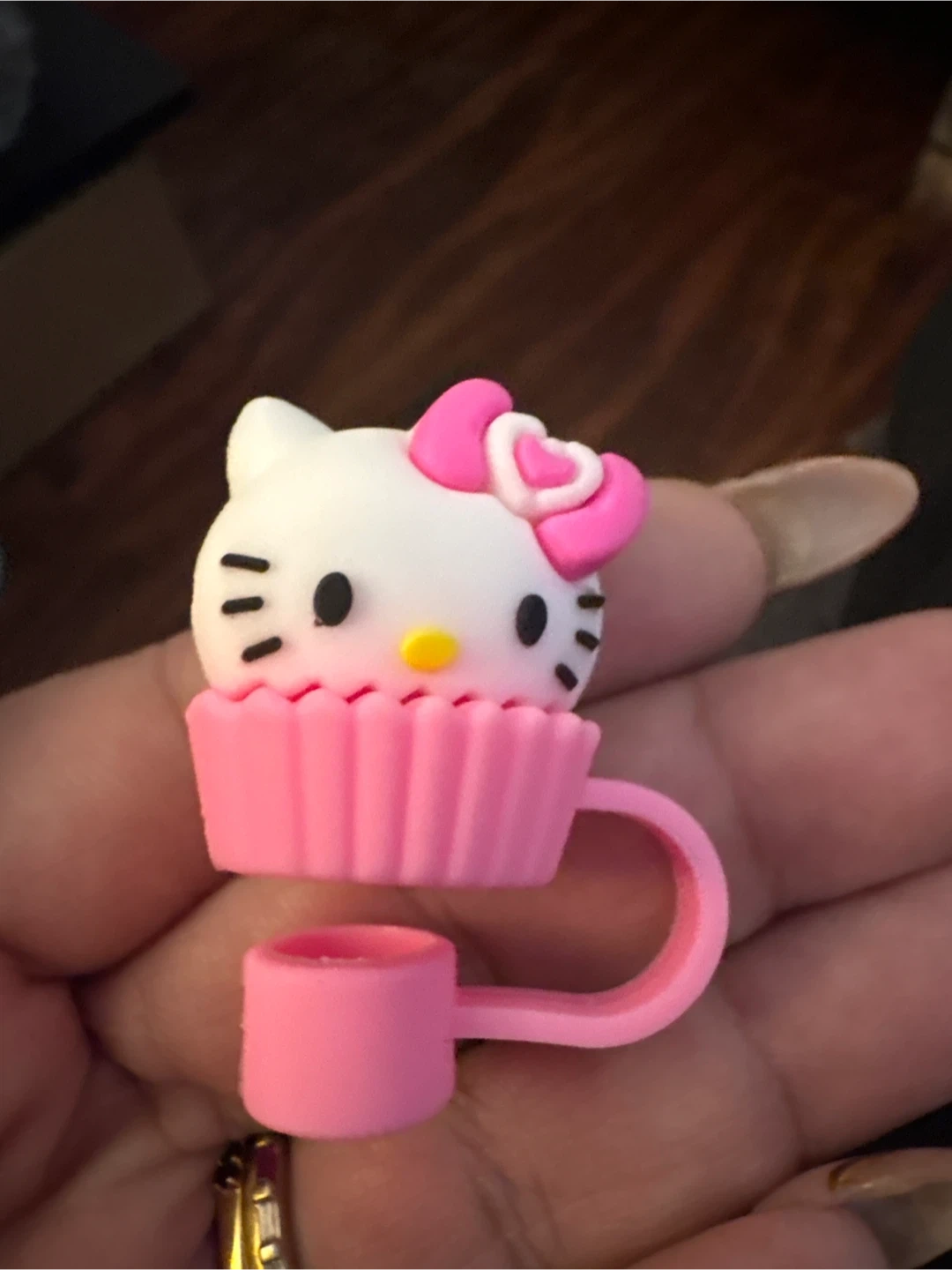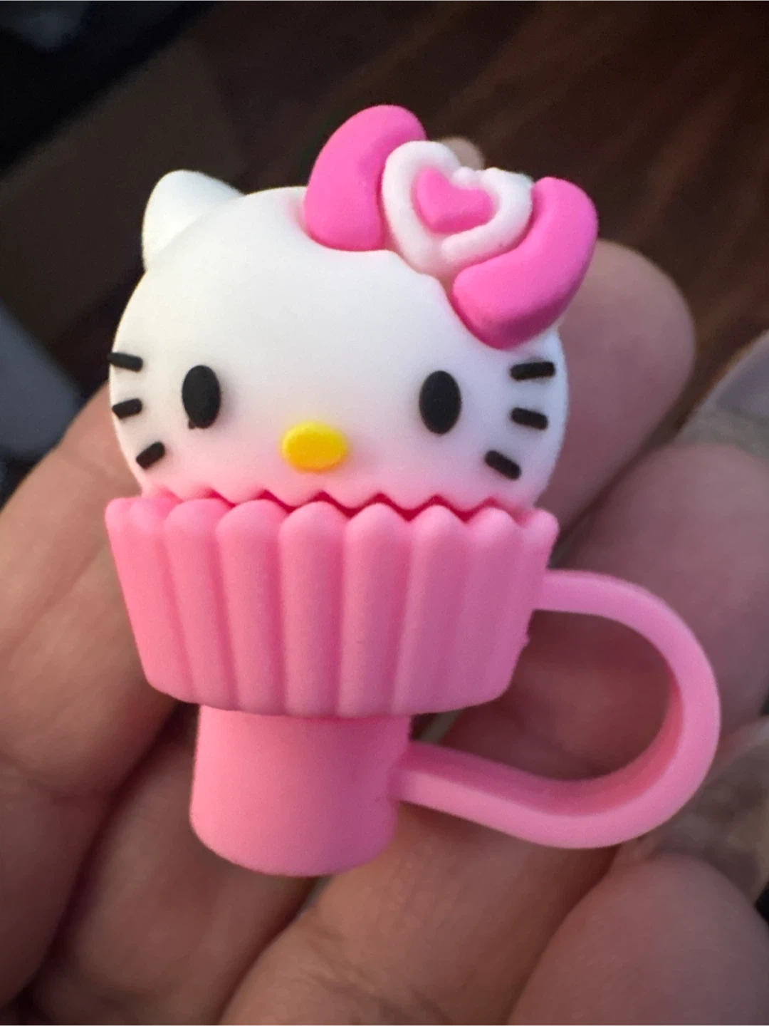 This is a cute Hello Kitty cupcake straw cap. It's pink and white and made of silicone. It's designed to fit on straws and protect them. Stanley cup straw cap
