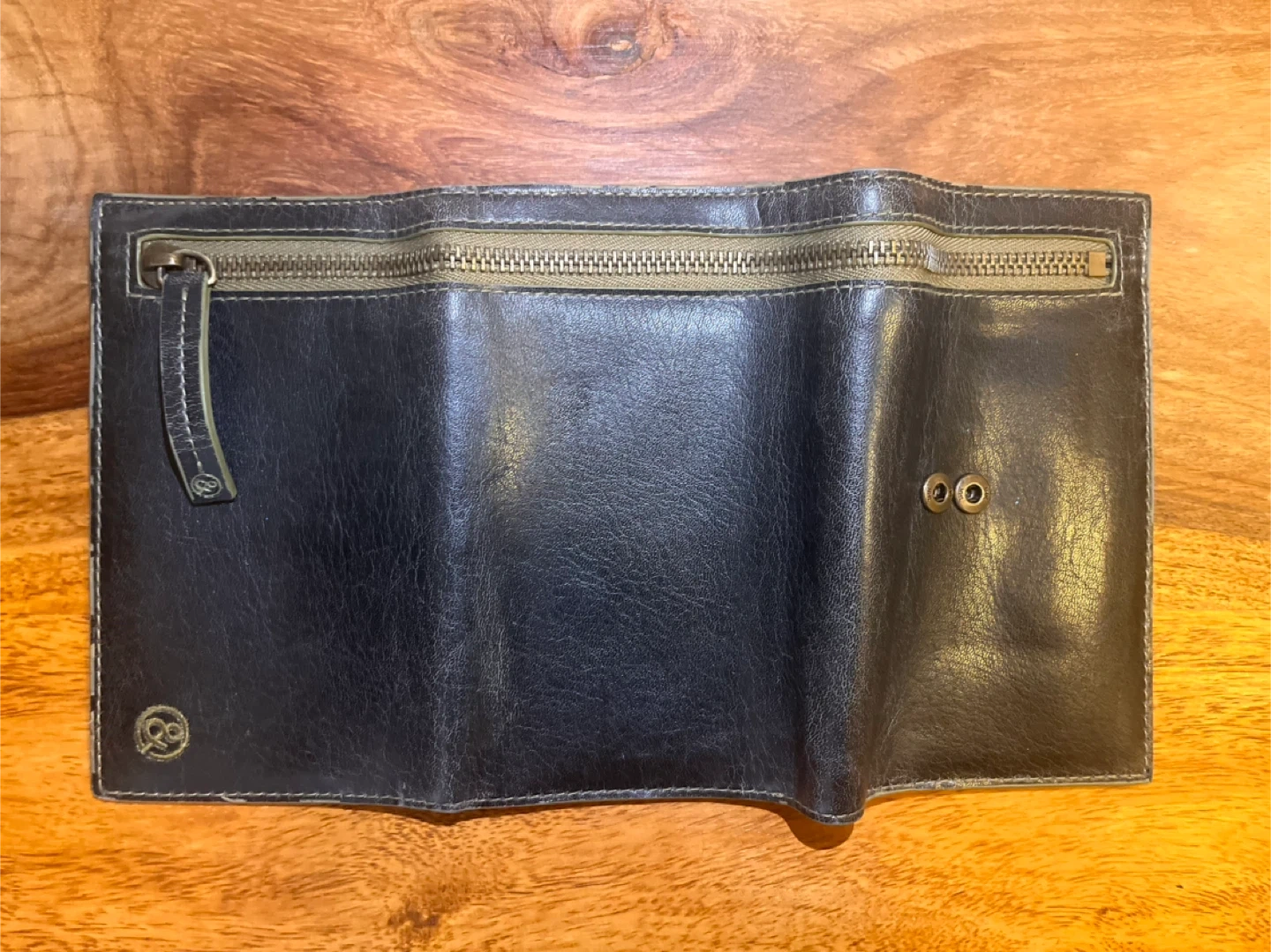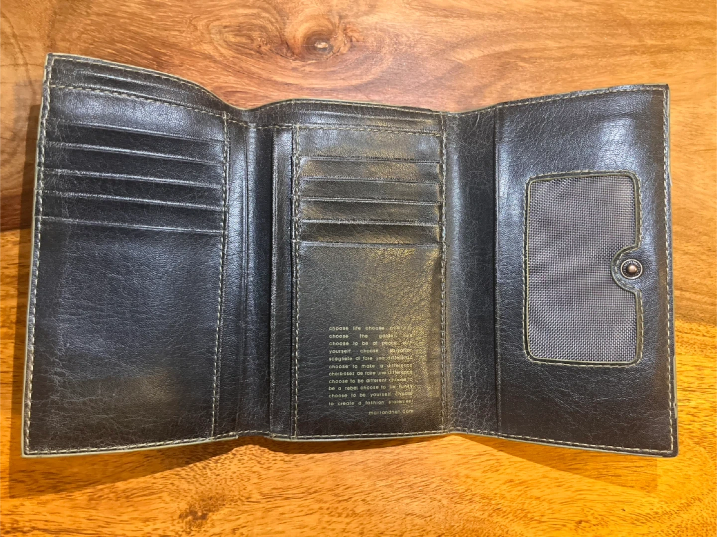 This stylish black tri-fold wallet is made of vegan leather. It has multiple card slots and a zippered coin pocket. The interior features a motivational quote and a clear ID window.