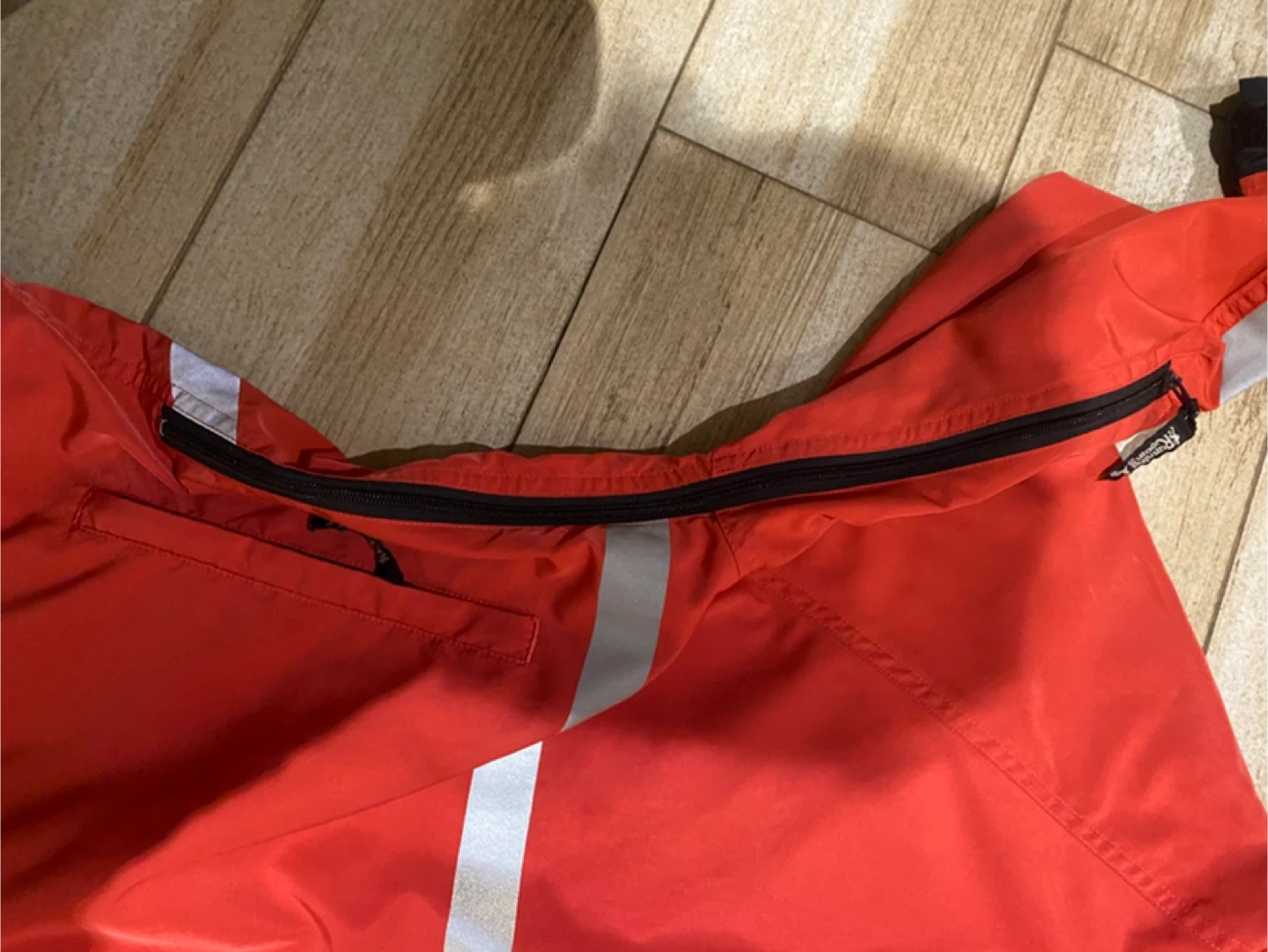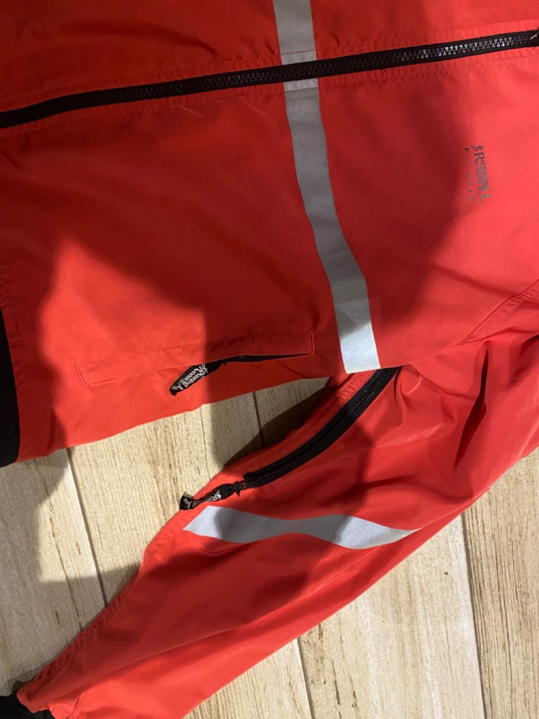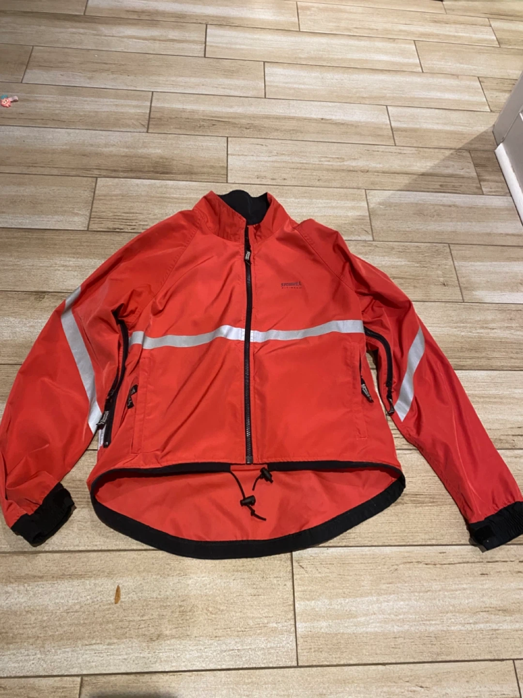 Selling a Running Room Fit-Wear jacket in great condition! It's a vibrant red colour with reflective stripes, perfect for visibility during runs. It has a zipper and drawstring, and longer back. Size is unisex xs.