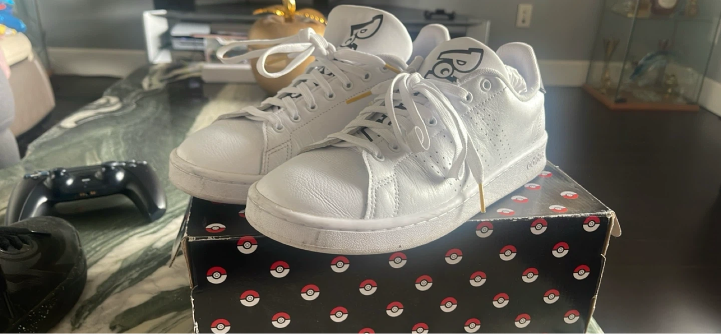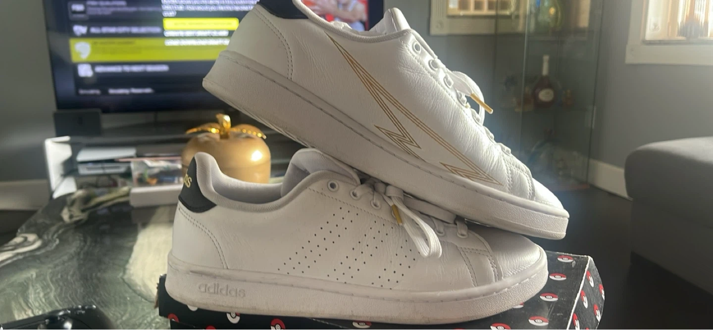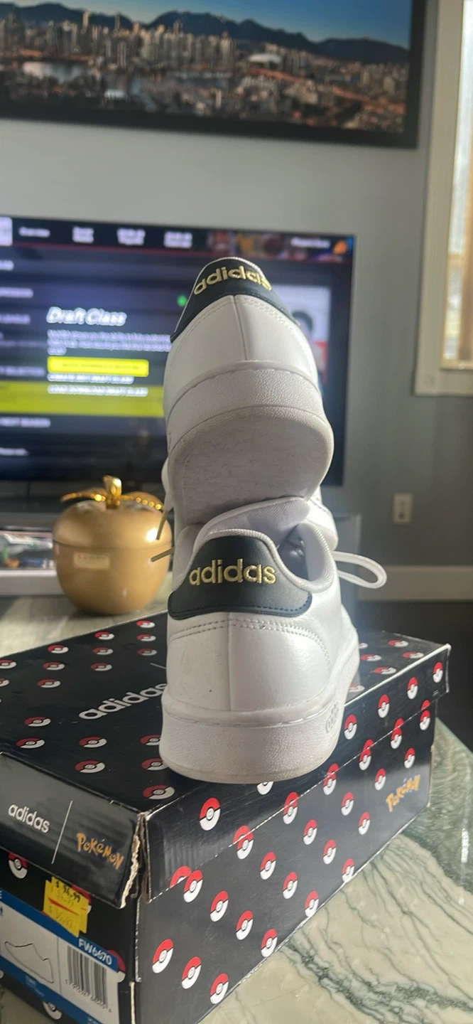 Classic white Adidas Advantage sneakers featuring subtle gold accent stripes on the side. These shoes are made of leather and come with the original Pokémon-themed Adidas box. Perforated details add breathability. Perfect for everyday wear!