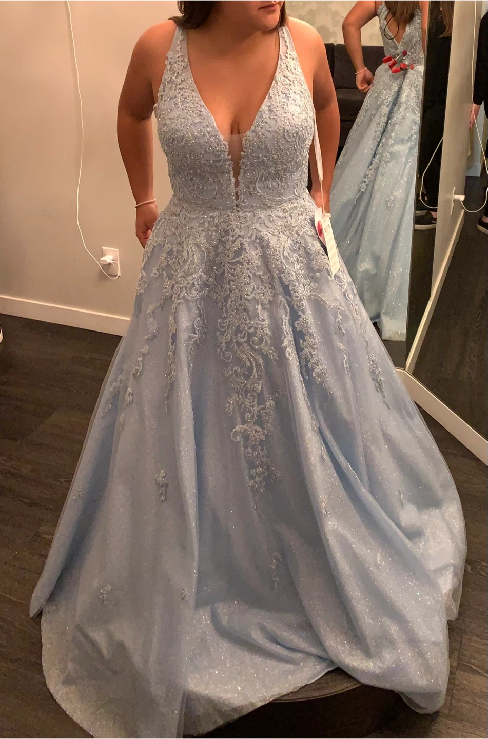 Beautiful light blue prom dress with intricate lace appliqué and shimmering sequin details. It features a V-neckline and a full, flowing skirt. This dress is perfect for formal events and dances!