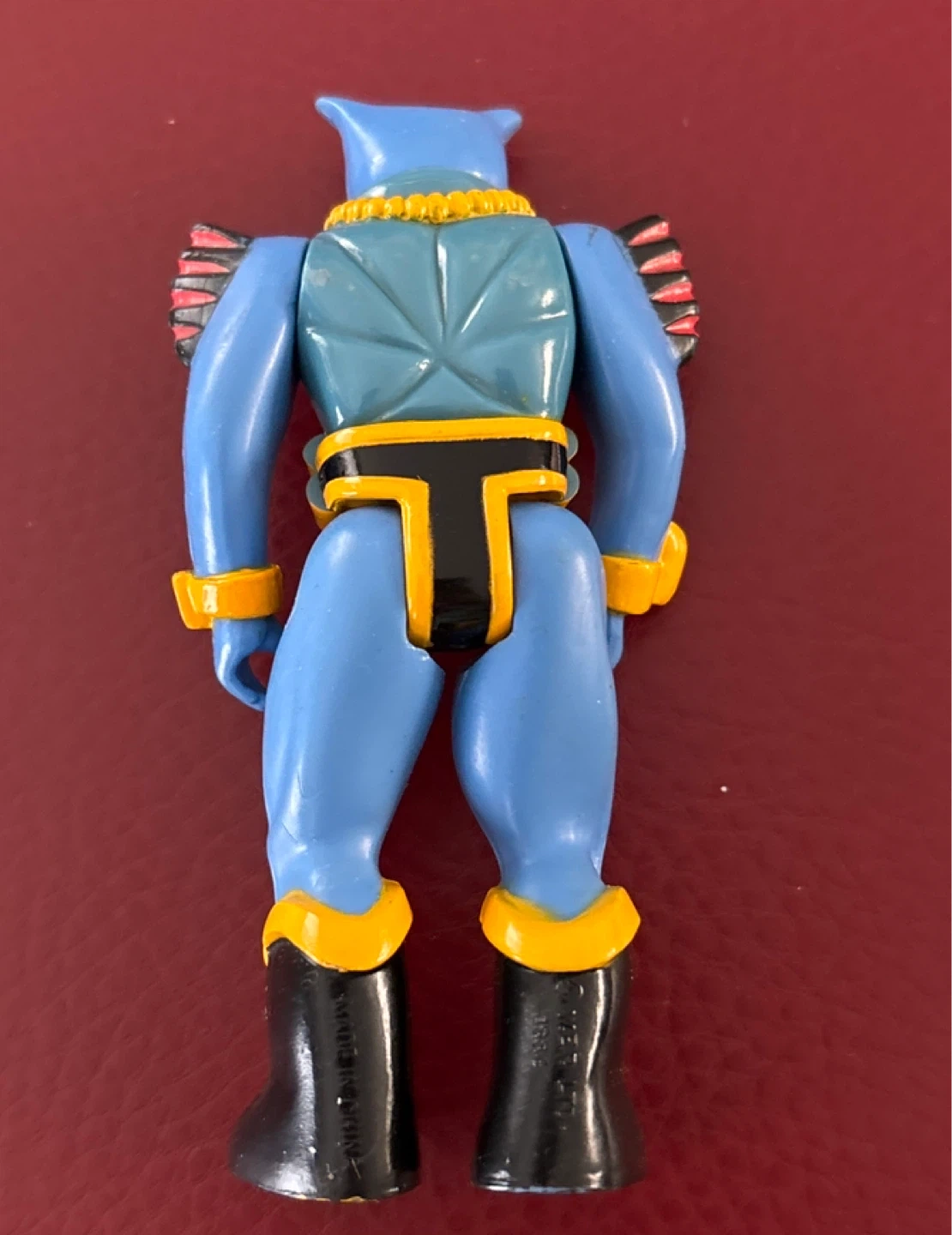 This is a vintage blue monster action figure. It features a unique design with red accents on its shoulders and boots. The figure has a striking yellow necklace detail. It's a great collectible piece!