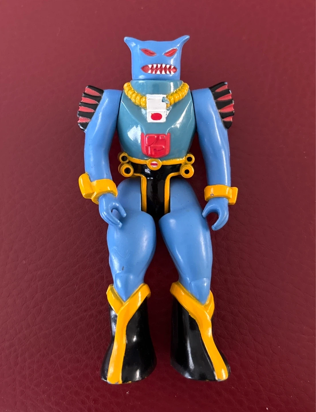 This is a vintage blue monster action figure. It features a unique design with red accents on its shoulders and boots. The figure has a striking yellow necklace detail. It's a great collectible piece!