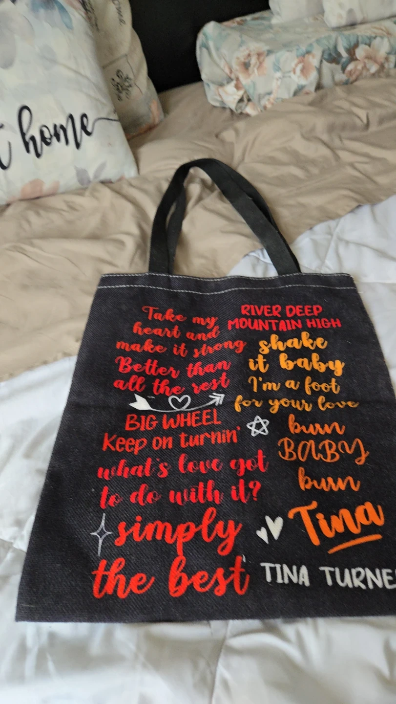 Tote bag featuring lyrics from Tina Turner's songs and her name. Denim-like material with sturdy black straps. Great for carrying groceries or everyday essentials.
