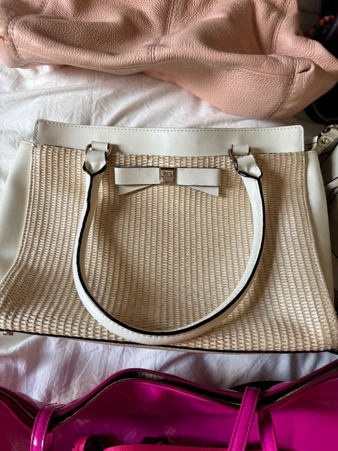 Pre-loved collection of women's handbags. Includes a blush pink Coach satchel with chain straps and dust bag. Several Kate Spade bags in various colours and styles. Perfect for everyday use or special occasions.