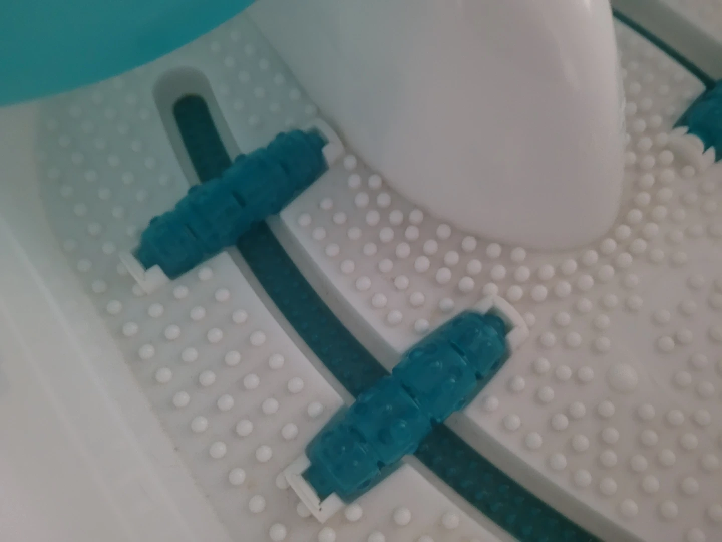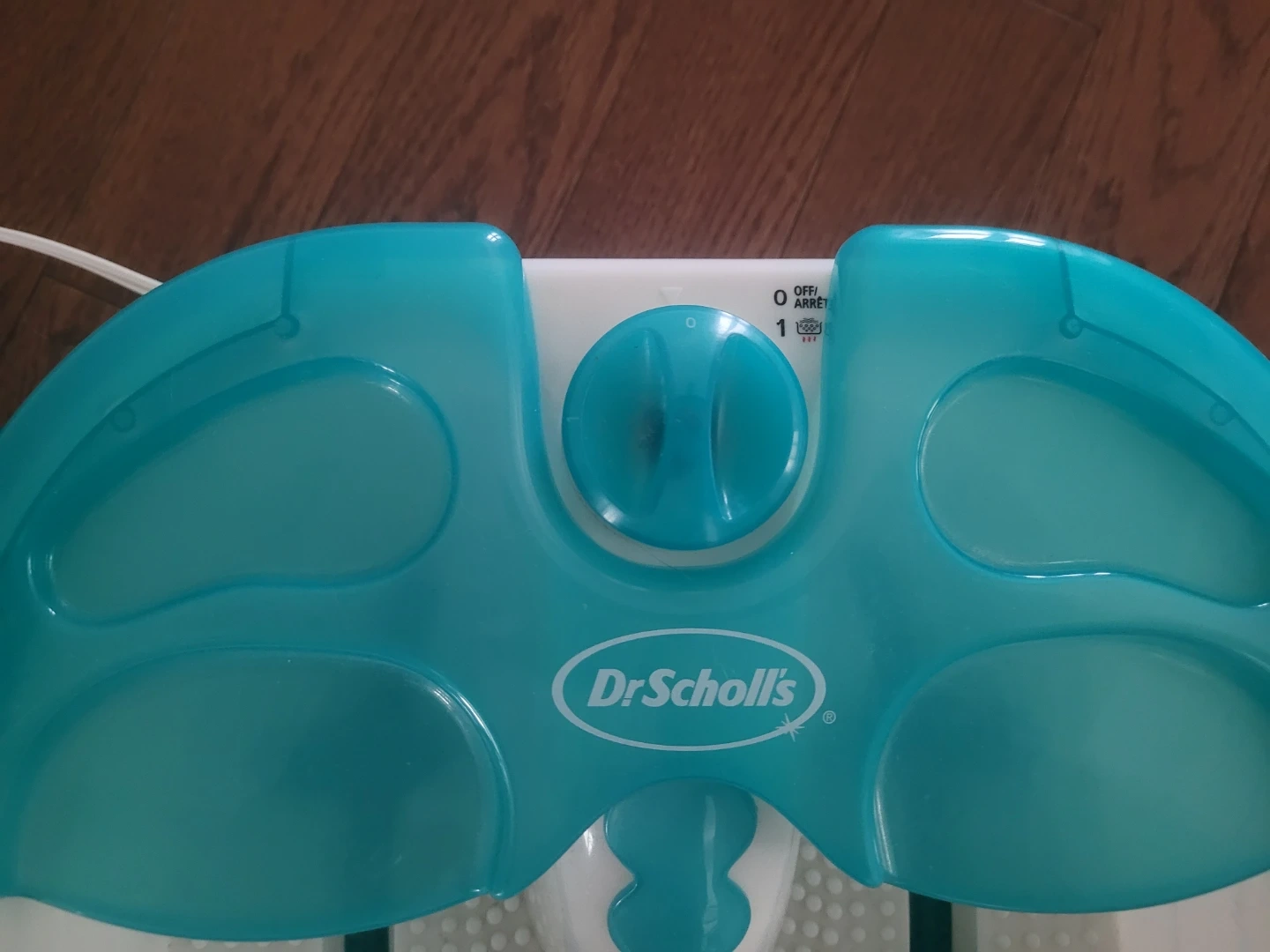 This is a Dr. Scholl's Invigorating Pedicure Foot Spa. It is white with teal accents. It has a control knob on top. This foot spa is designed to invigorate and pamper your feet with its massage rollers and soothing heat