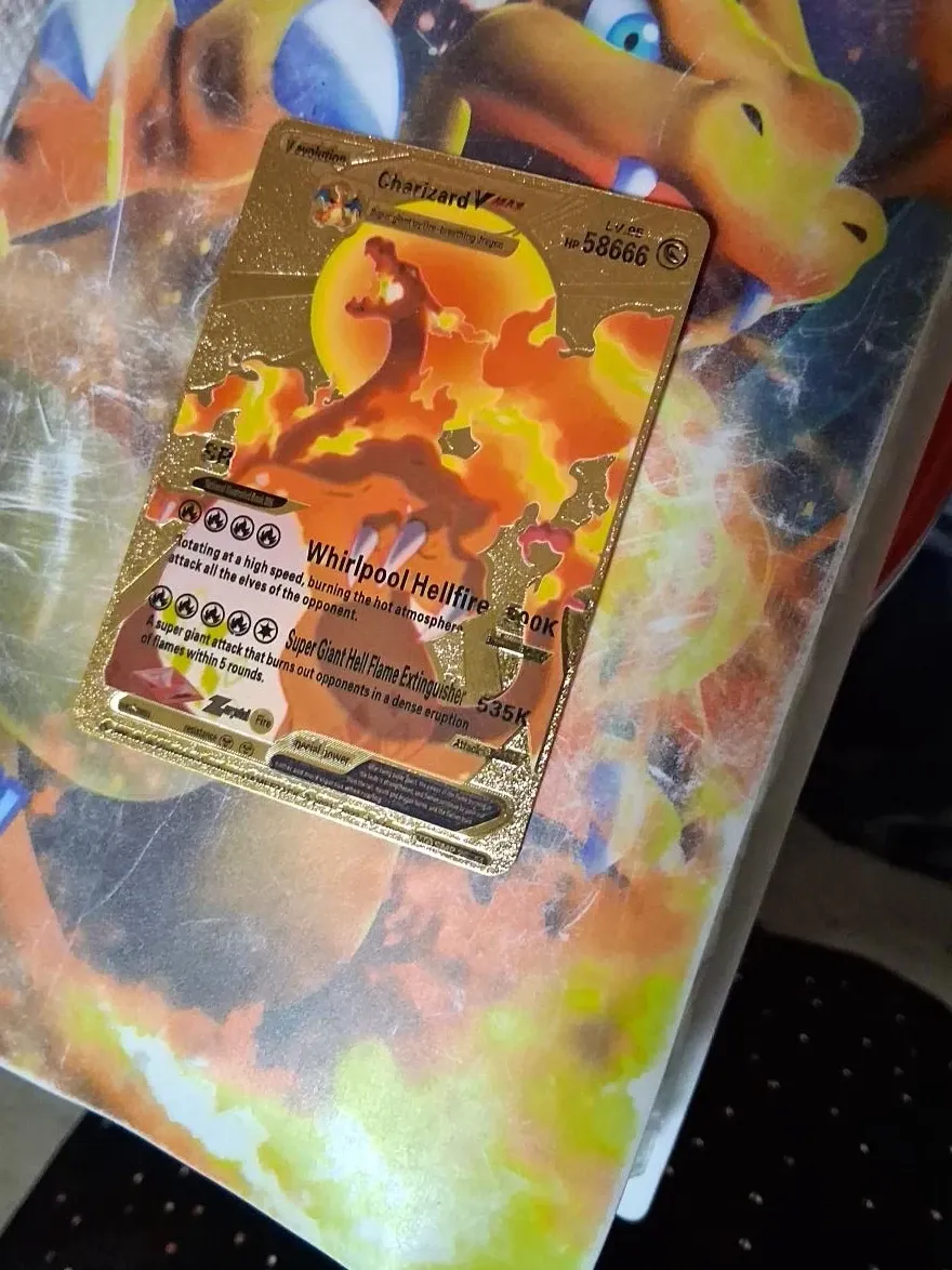 This is a Charizard VMAX gold trading card. It features the Whirlpool Hellfire attack and Super Giant Hell Flame Extinguisher attack. Great for collectors!