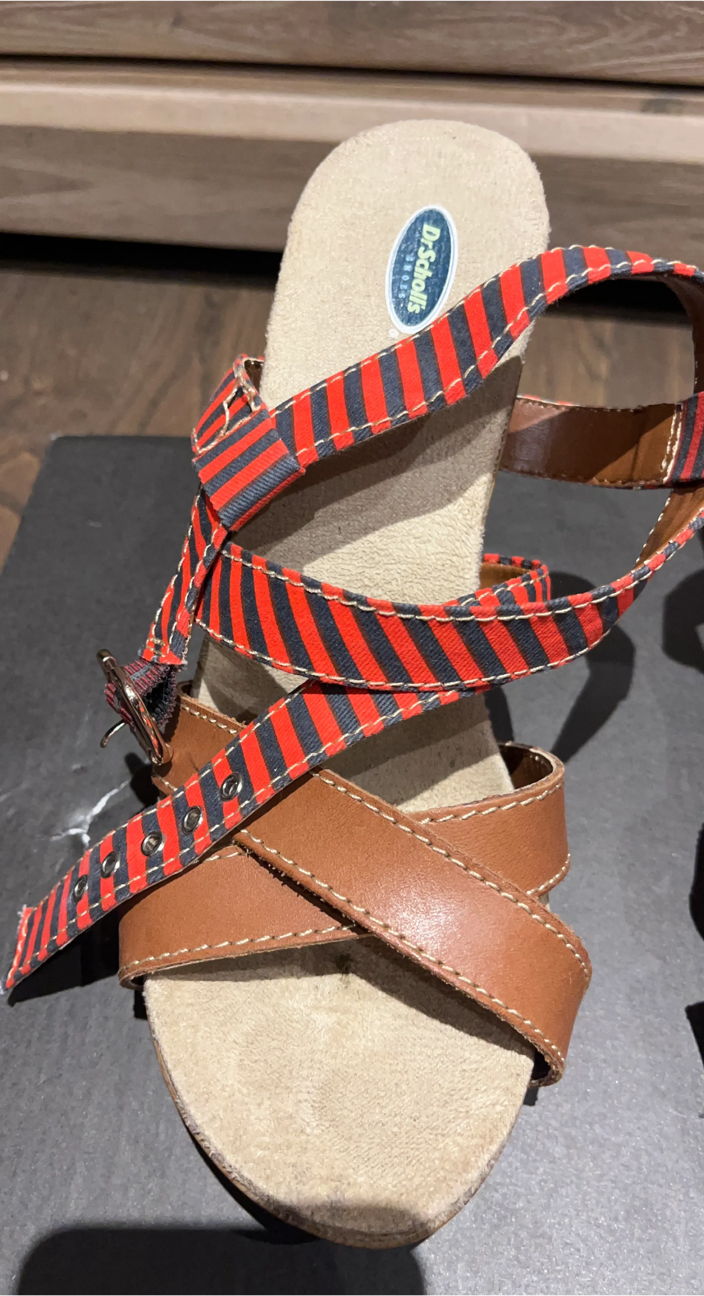 Dr. Scholl's sandals with a striped fabric ankle strap and brown leather crisscross straps. These sandals offer a comfortable footbed with a cork-like sole.