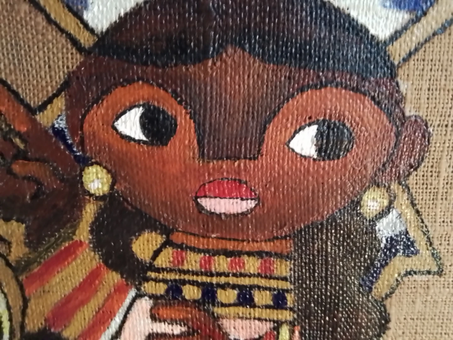 Unique framed artwork. Painted on burlap canvas. Features stylized figure. Warm earthy tones. Wooden frame. Artist's signature visible.