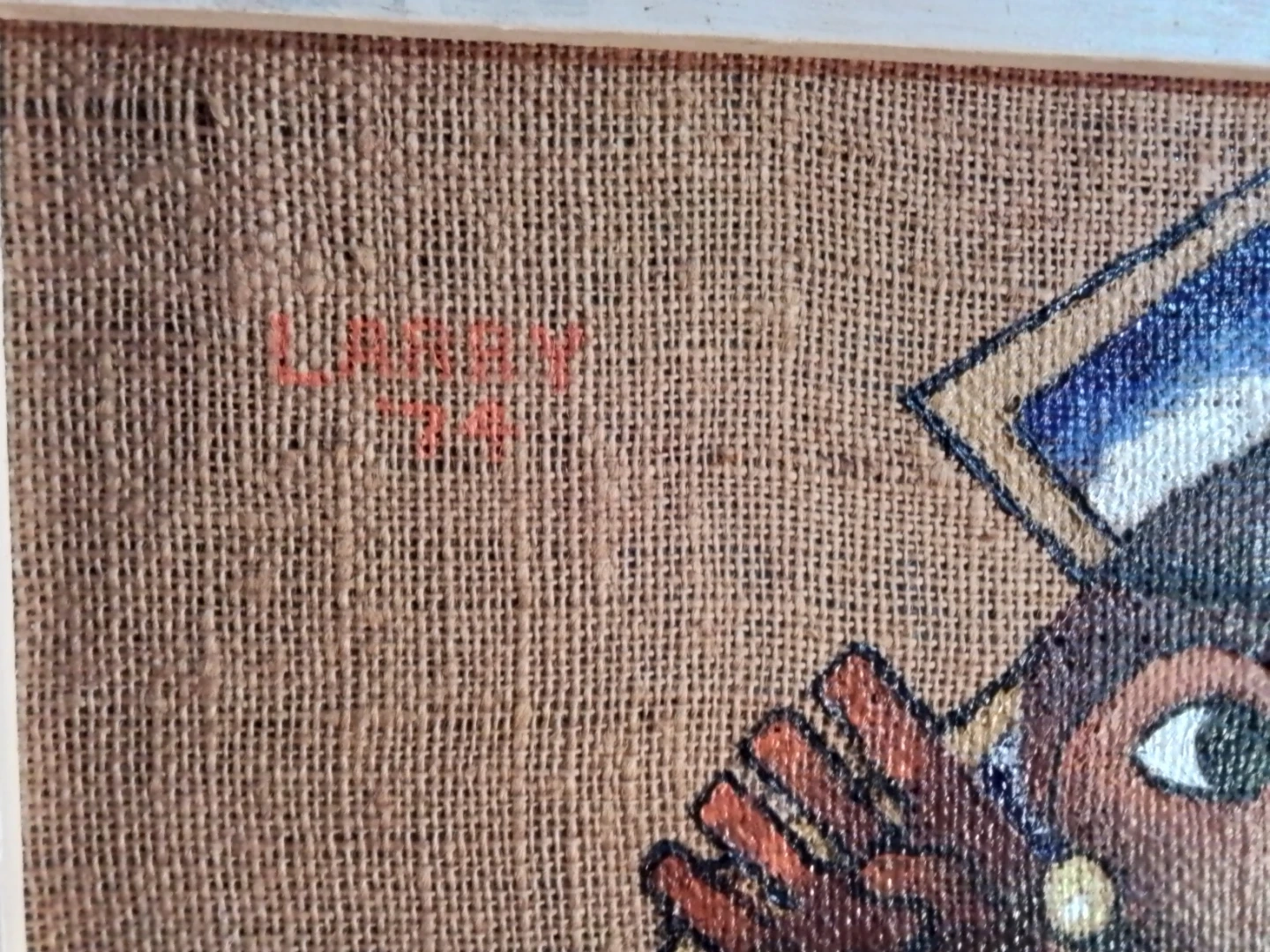 Art piece featuring painted figure on sackcloth. Mounted on wood. Signed, Larry 74. Art is 19.5 X15.5 and frame is 25 3/4 X 21 3/4