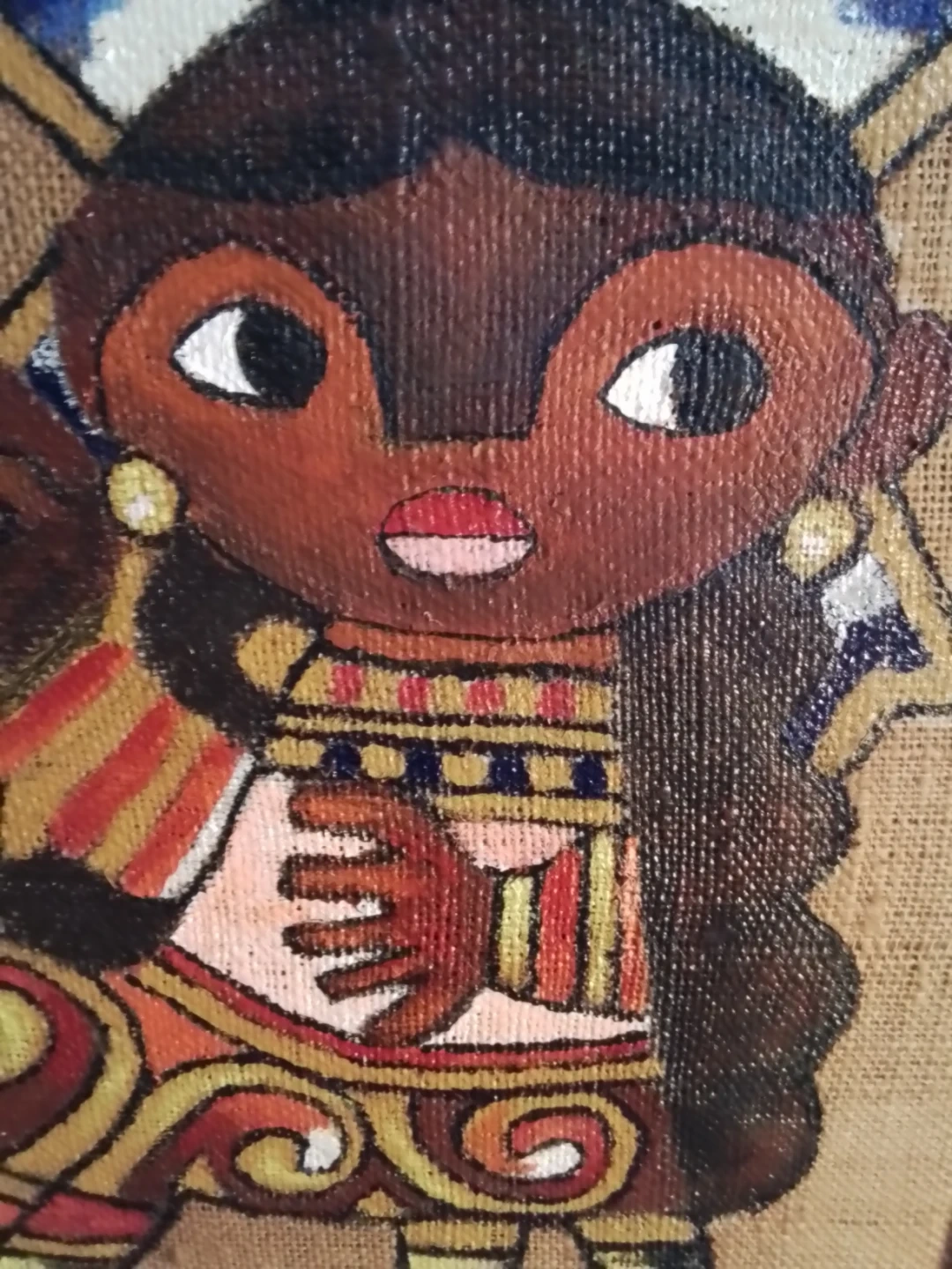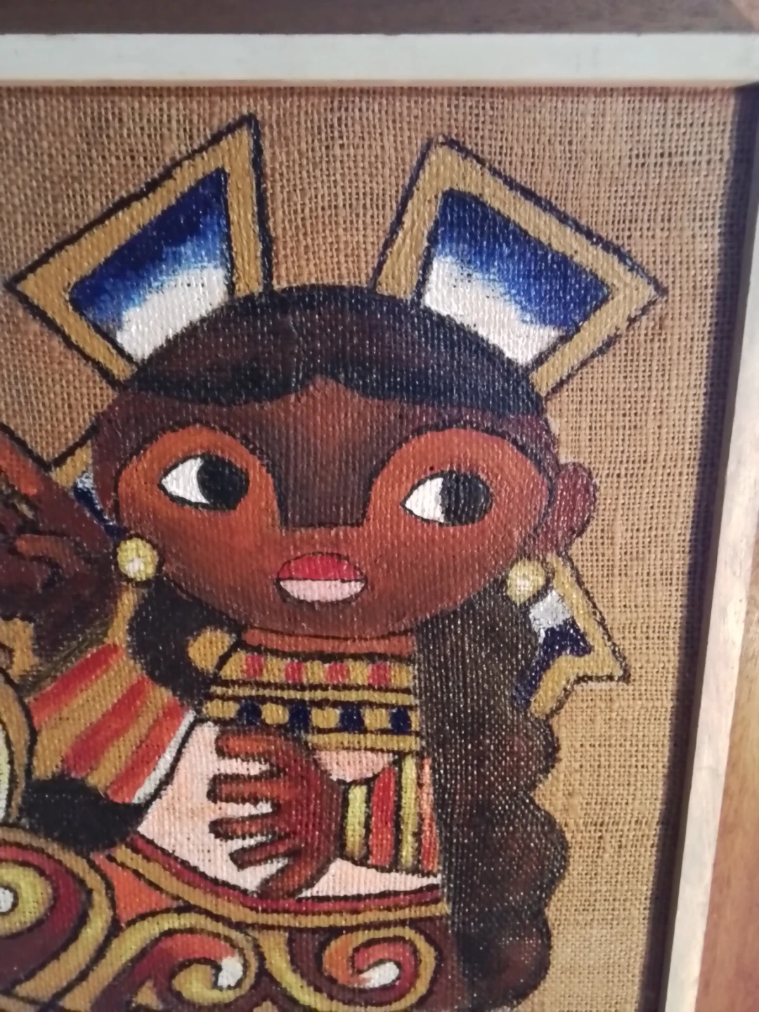 Unique framed artwork. Painted on burlap canvas. Features stylized figure. Warm earthy tones. Wooden frame. Artist's signature visible.