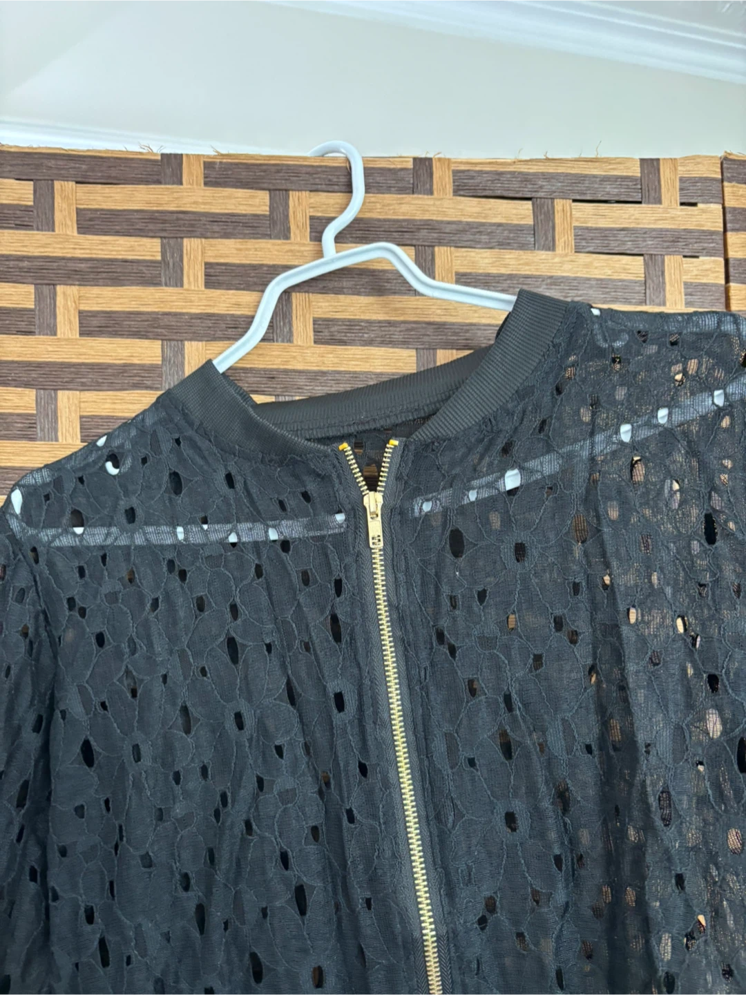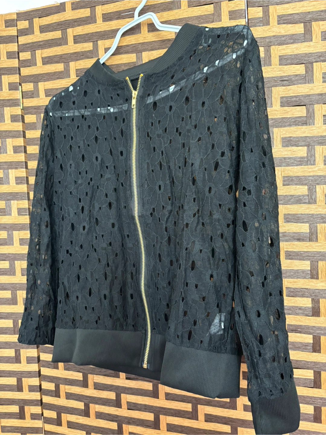 Selling a stylish black lace bomber jacket in size L! It's made of 100% polyester and features a unique lace design with a gold zipper. Perfect for layering or adding a touch of elegance to any outfit