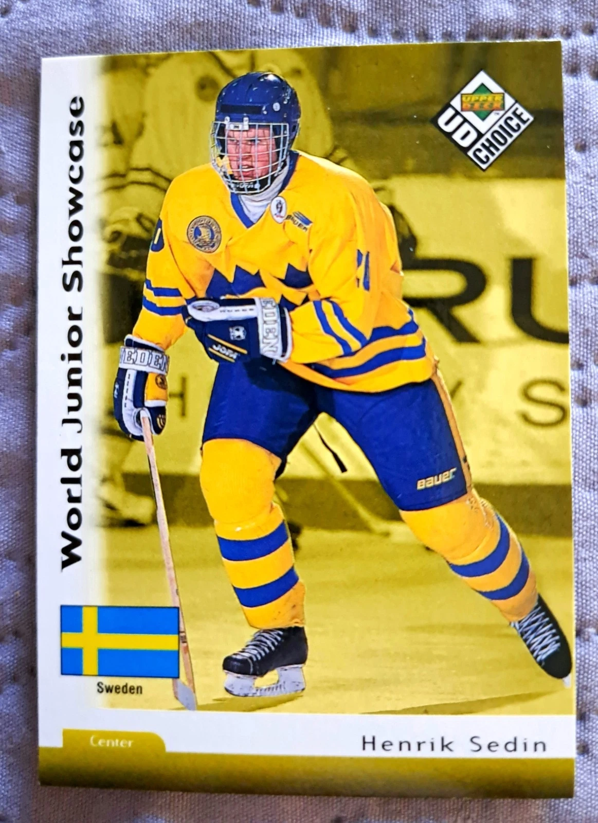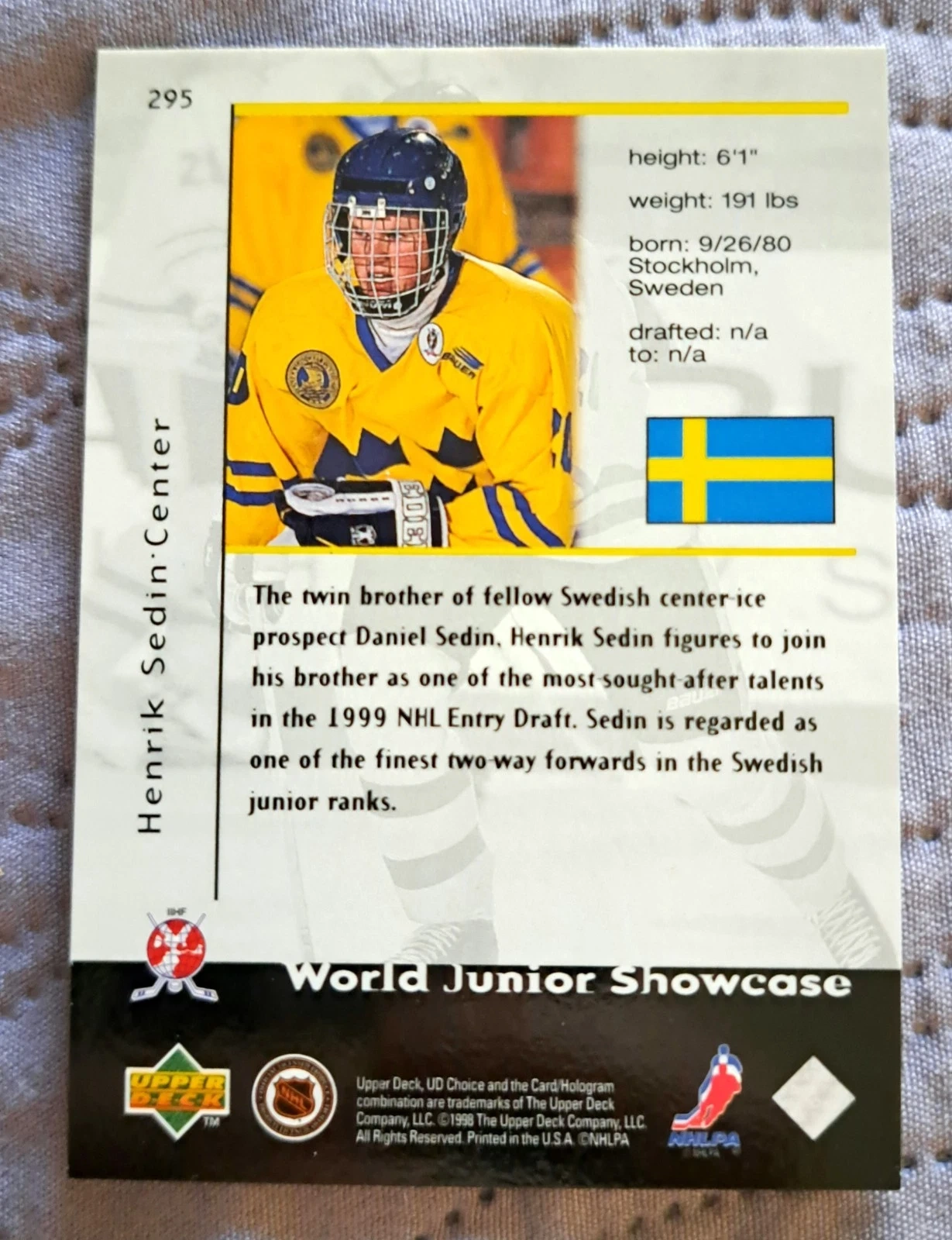 Ungraded - Near Mint or Better. Standard size sports trading card from the 1998-99 Upper Deck Choice set, featuring Henrik Sedin. This original, vintage card is from the 1998 year and represents his rookie season. It's part of the World Junior Championship series and shows him in his Sweden and Vancouver Canucks team colors. Card number 295.