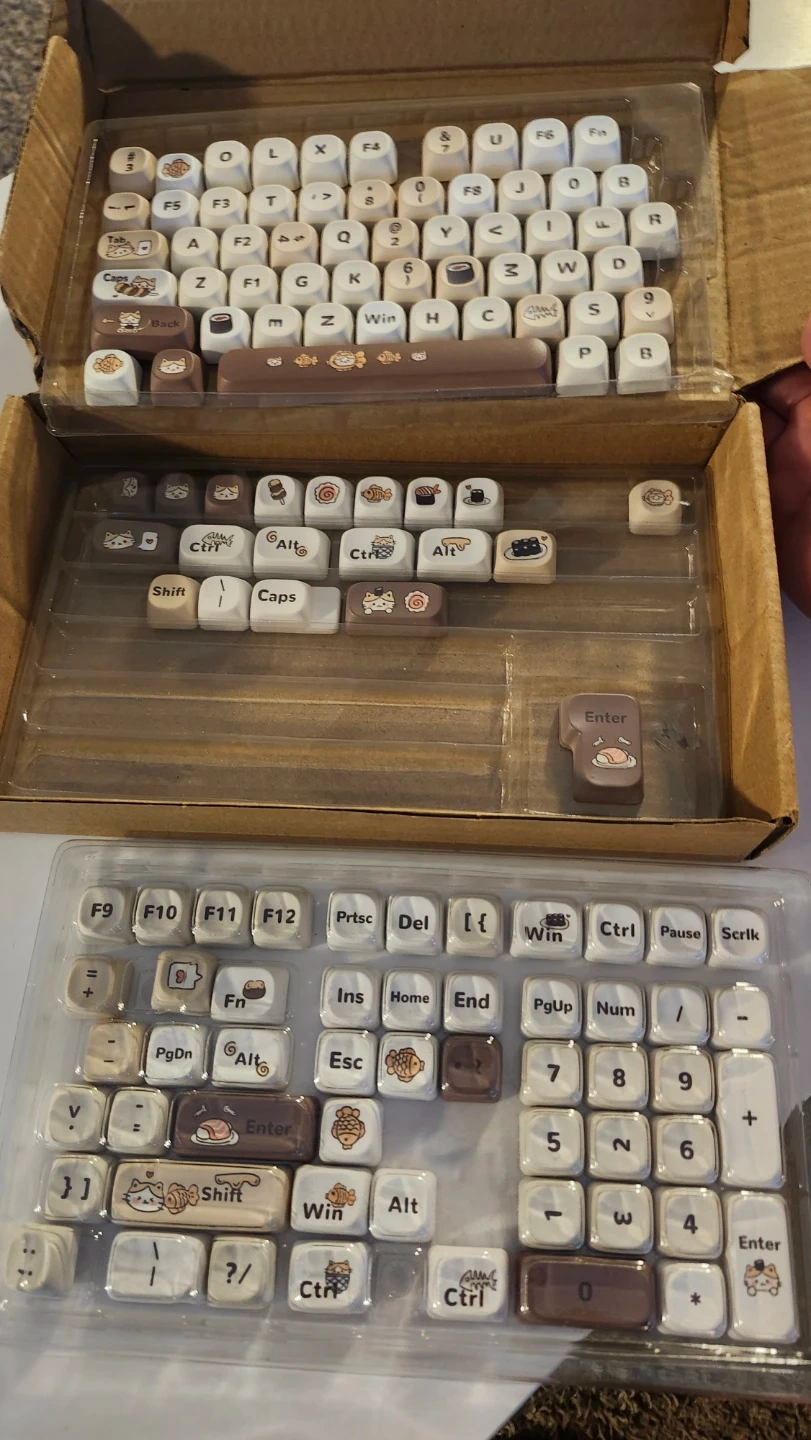 A set of adorable keycaps featuring a cute cat and sushi theme. These keycaps are designed to personalize your mechanical keyboard with a playful and charming aesthetic. The set includes a variety of keys, perfect for a full keyboard layout.
