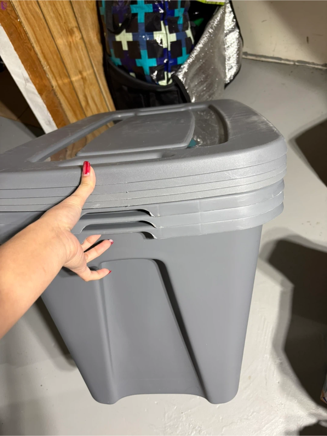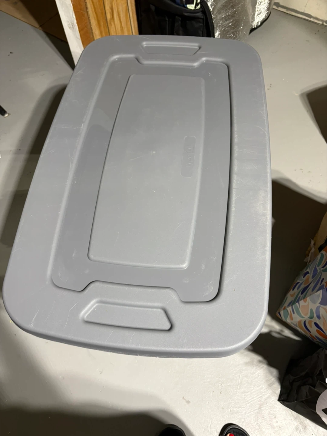 This is a grey plastic storage bin. It has a lid and handles for easy carrying. Perfect for organizing items in your home or garage.