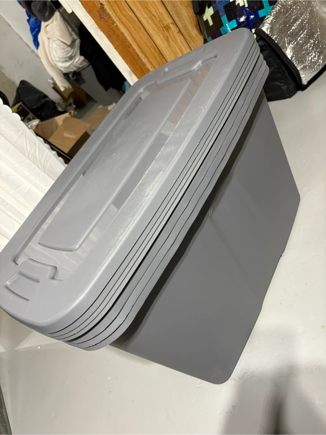 This is a grey plastic storage bin. It has a lid and handles for easy carrying. Perfect for organizing items in your home or garage.