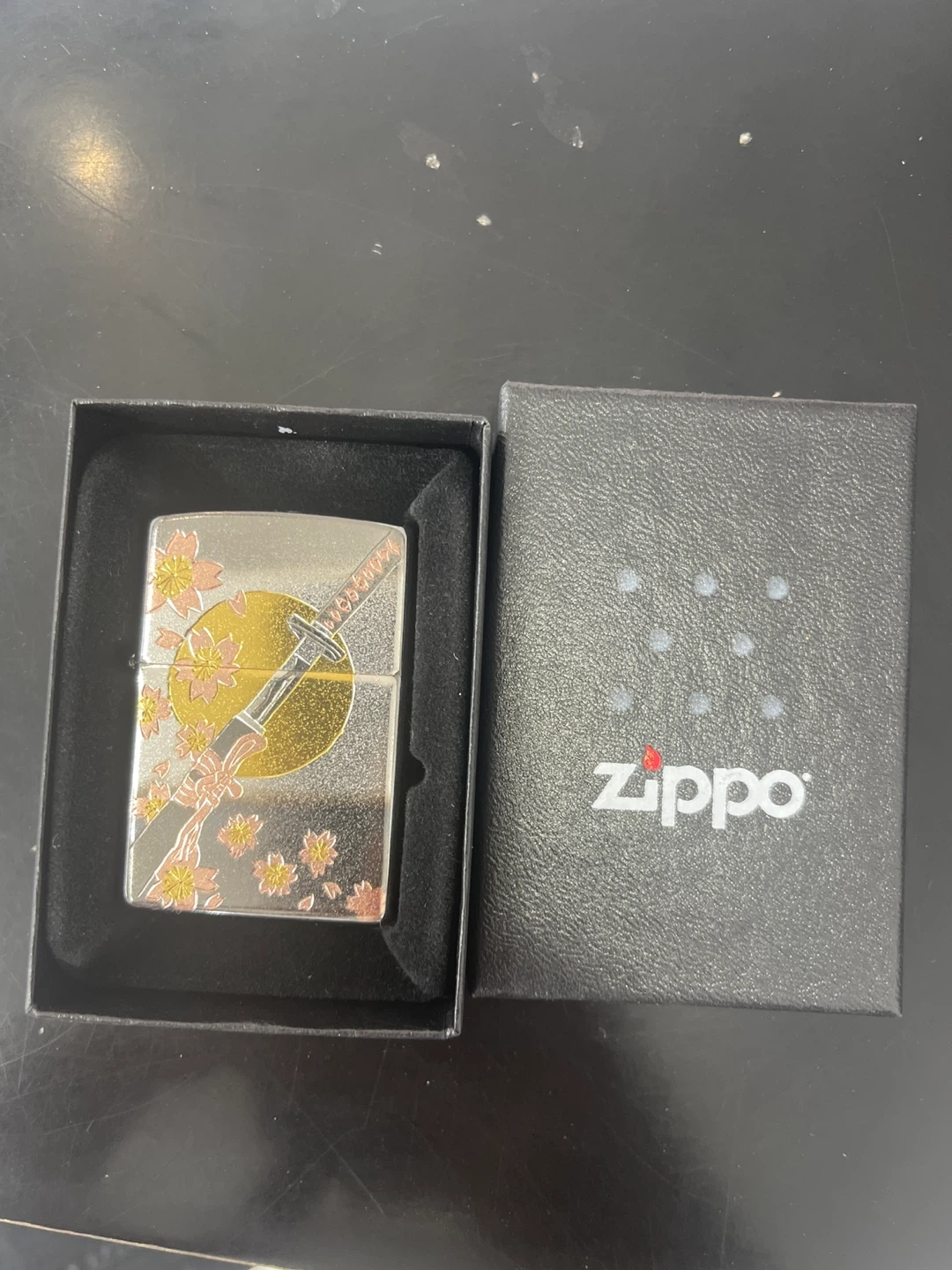 This Zippo lighter features a detailed design of cherry blossoms and a sword. It includes the original Zippo box. This lighter showcases Japanese-inspired artistry. It's ideal for collectors or anyone who appreciates unique designs!