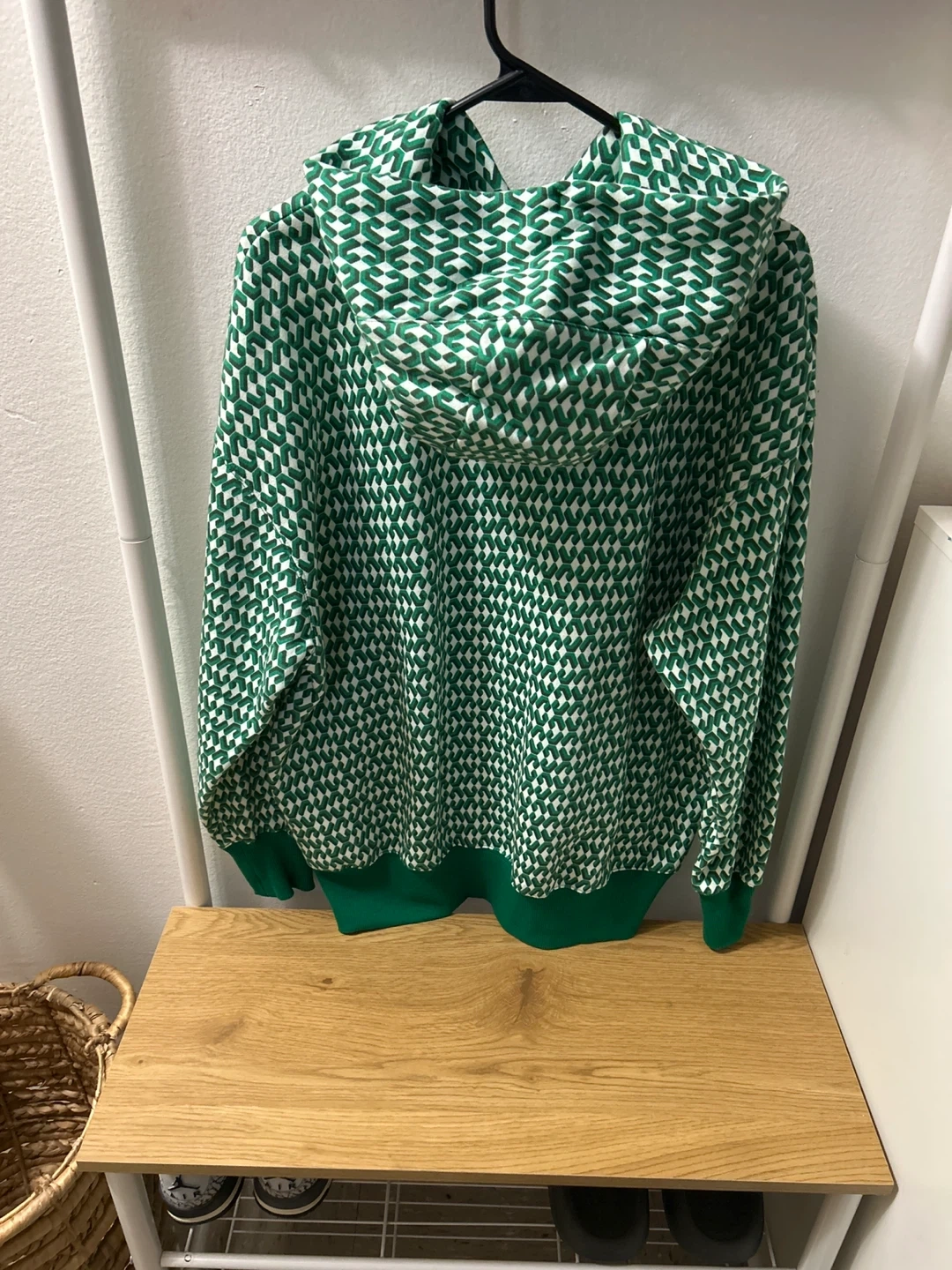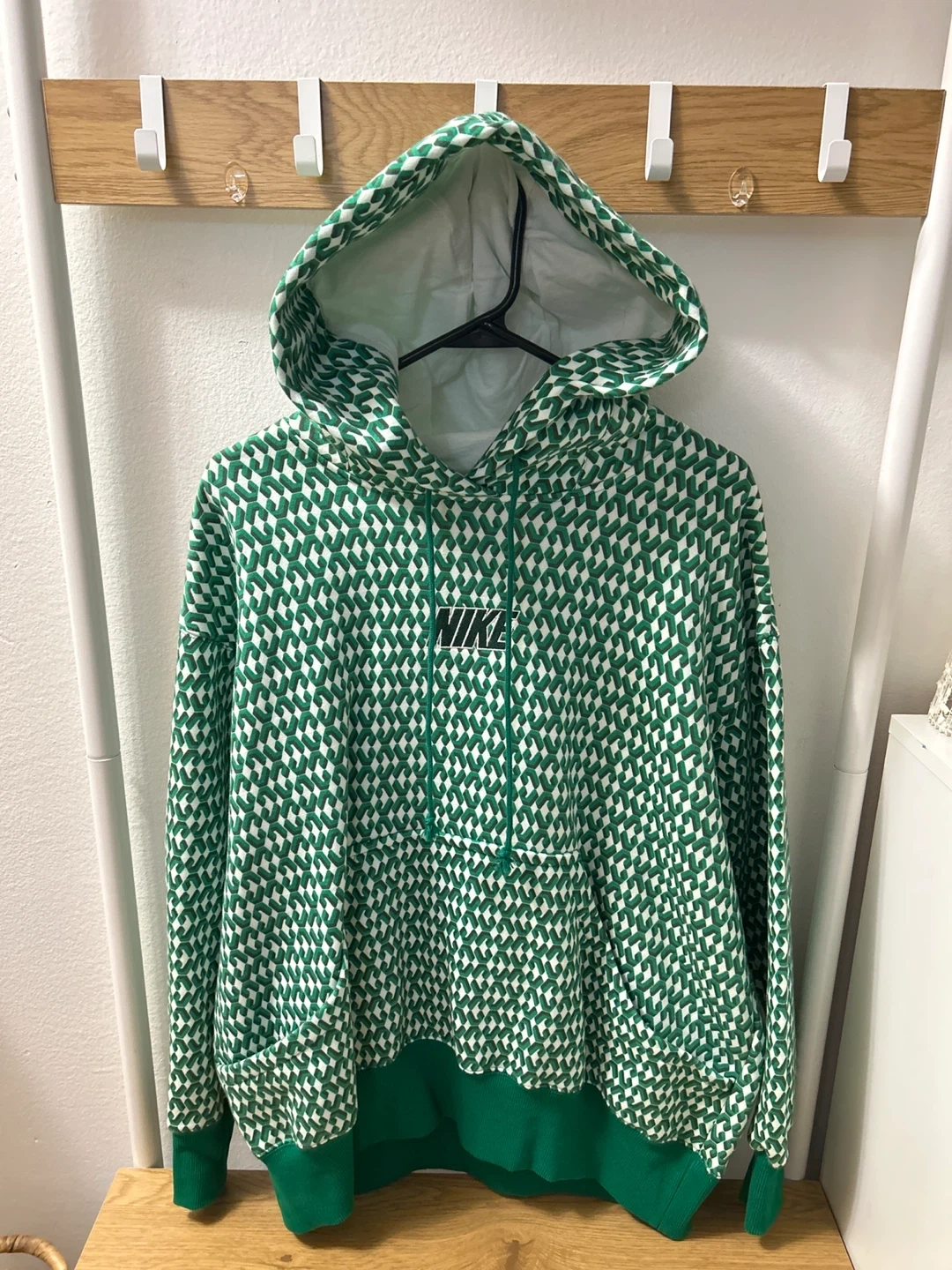 This Nike hoodie features a green and white geometric pattern throughout. It has a classic pullover design with a front pocket and a drawstring hood. Made with comfortable fabric for everyday wear.