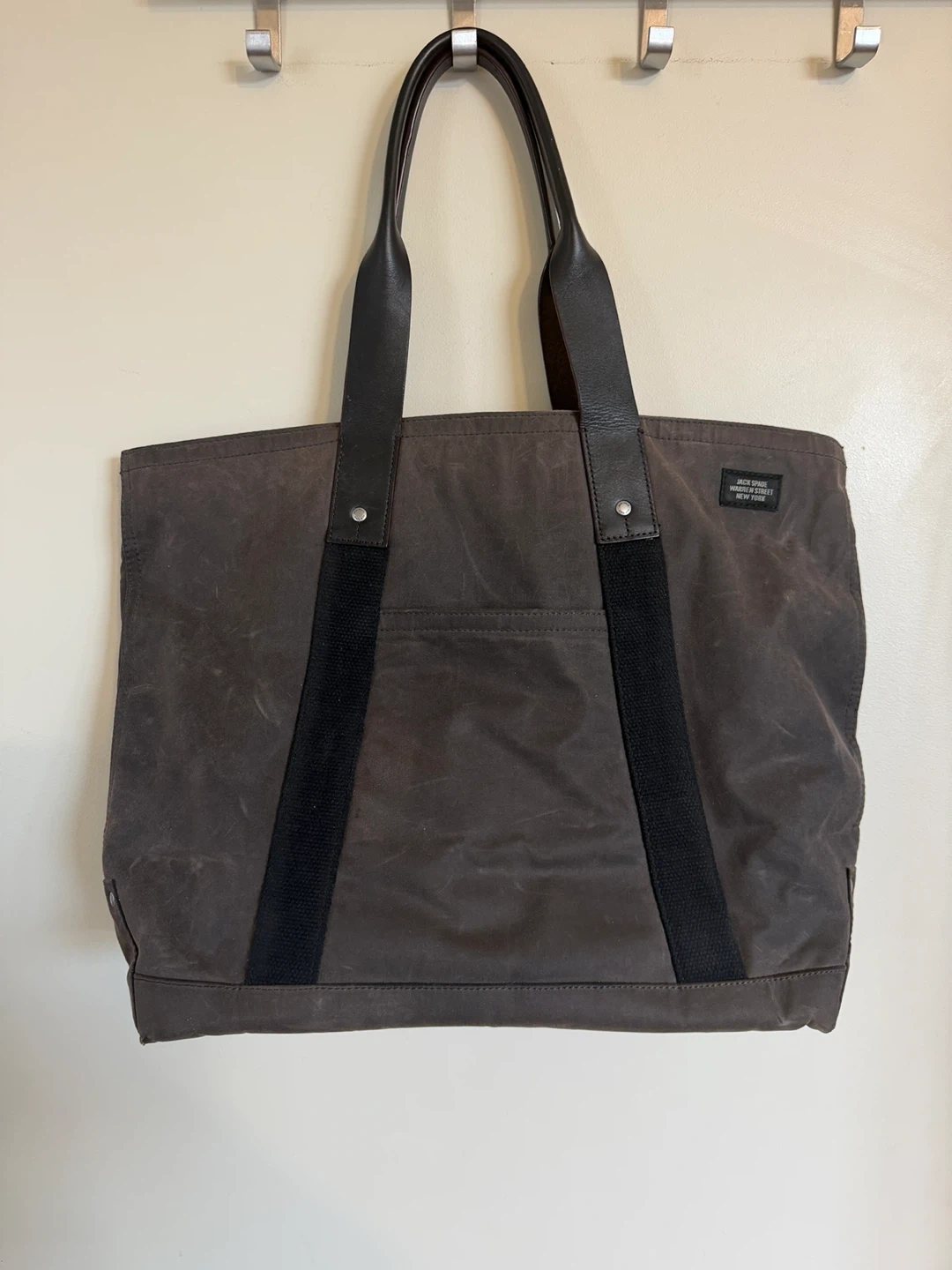 A brown canvas tote bag with black leather handles. It features a simple design with black webbing straps on the front. This bag is great for everyday use.meet in downtown or Markham