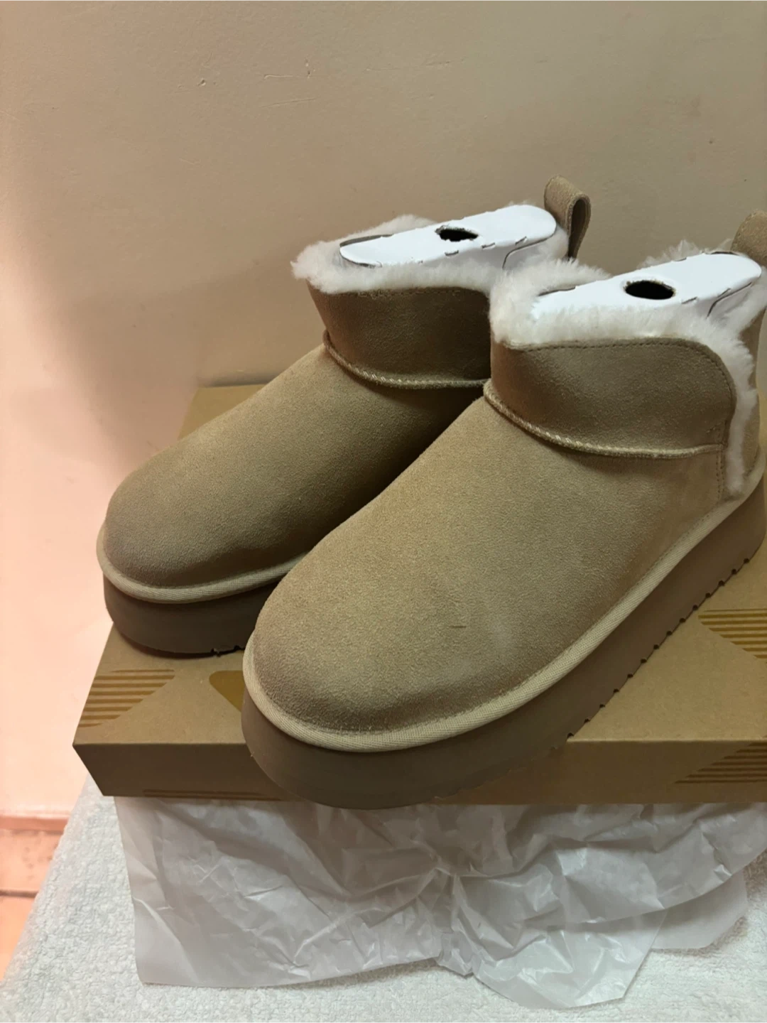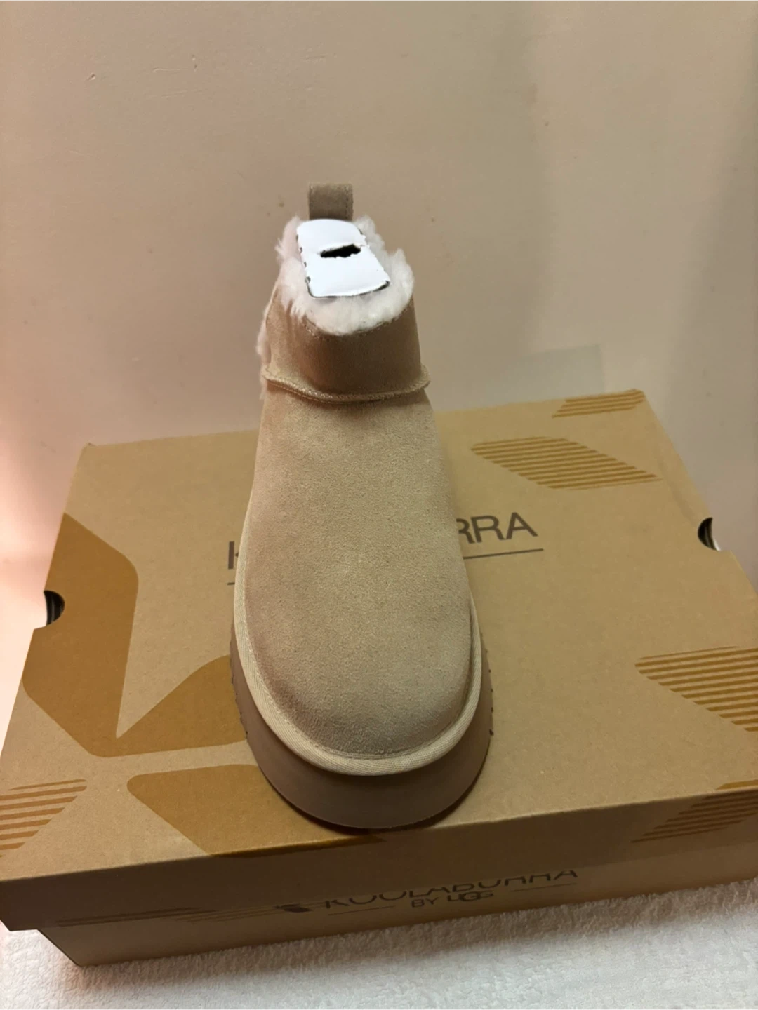 These are new Koolaburra by UGG women's Koola Ultra Mini Platform boots. They're a tan suede material with faux fur lining. The platform sole adds a stylish touch. Comes with original box. Boots are a US size 8.