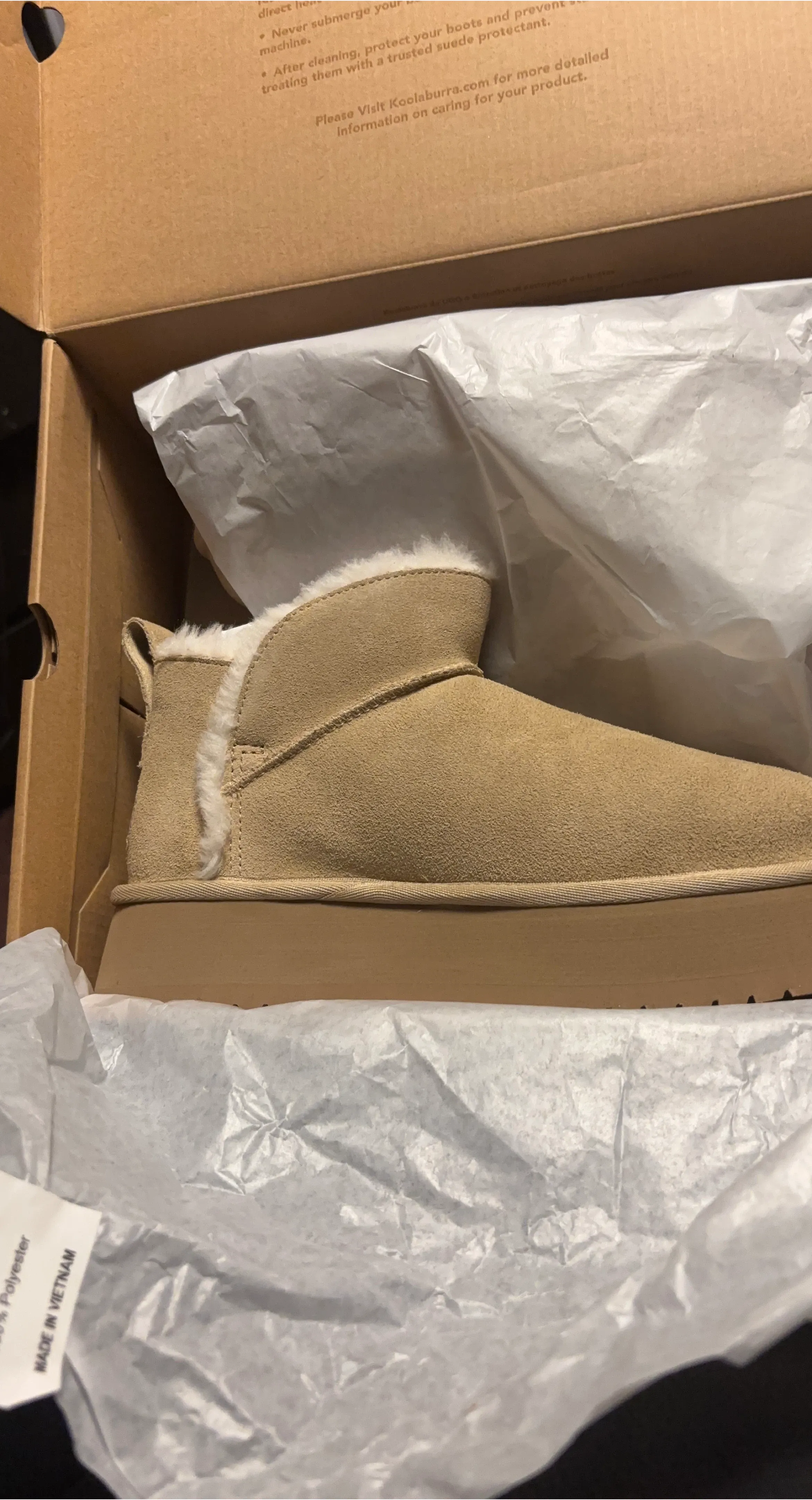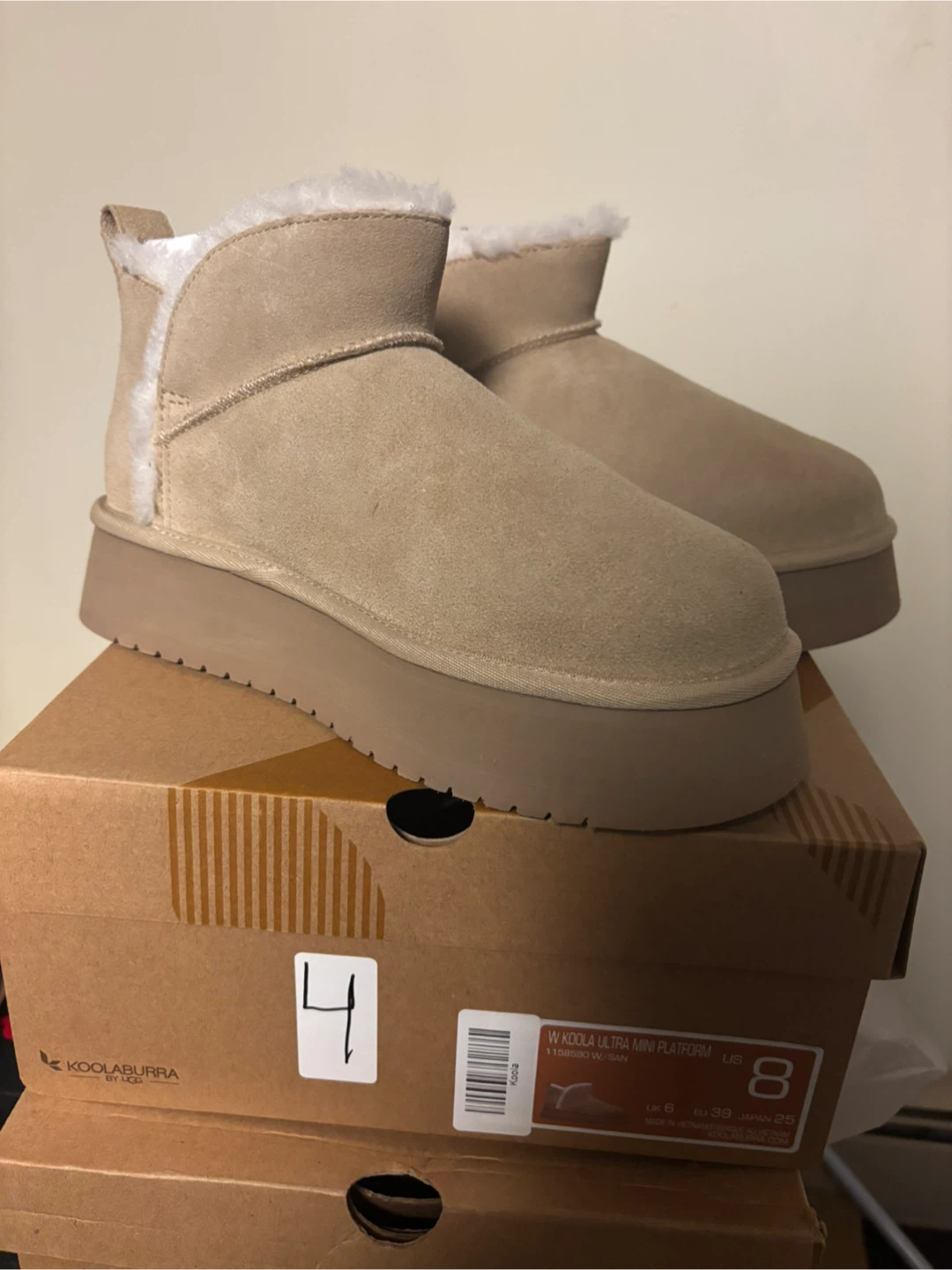 These are new Koolaburra by UGG women's Koola Ultra Mini Platform boots. They're a tan suede material with faux fur lining. The platform sole adds a stylish touch. Comes with original box. Boots are a US size 8.