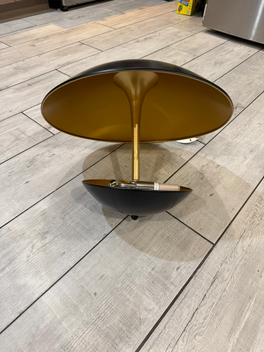 Selling a stylish mushroom-shaped table lamp. It features a black exterior with a gold interior, giving it a modern and elegant look. Perfect for adding a touch of sophistication to any room