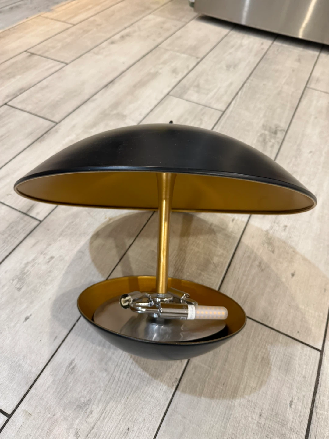 Selling a stylish mushroom-shaped table lamp. It features a black exterior with a gold interior, giving it a modern and elegant look. Perfect for adding a touch of sophistication to any room