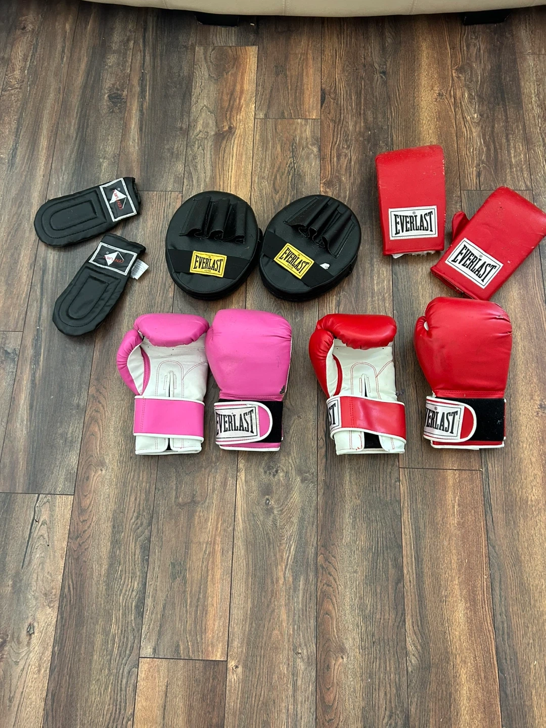 This set includes Everlast boxing gloves in pink (size 12) and red (size 14), along with black focus mitts and red hand pads. Gloves are adult-sized and made of synthetic leather. Will trade for a pair of men’s hockey gloves. Located in Beeton