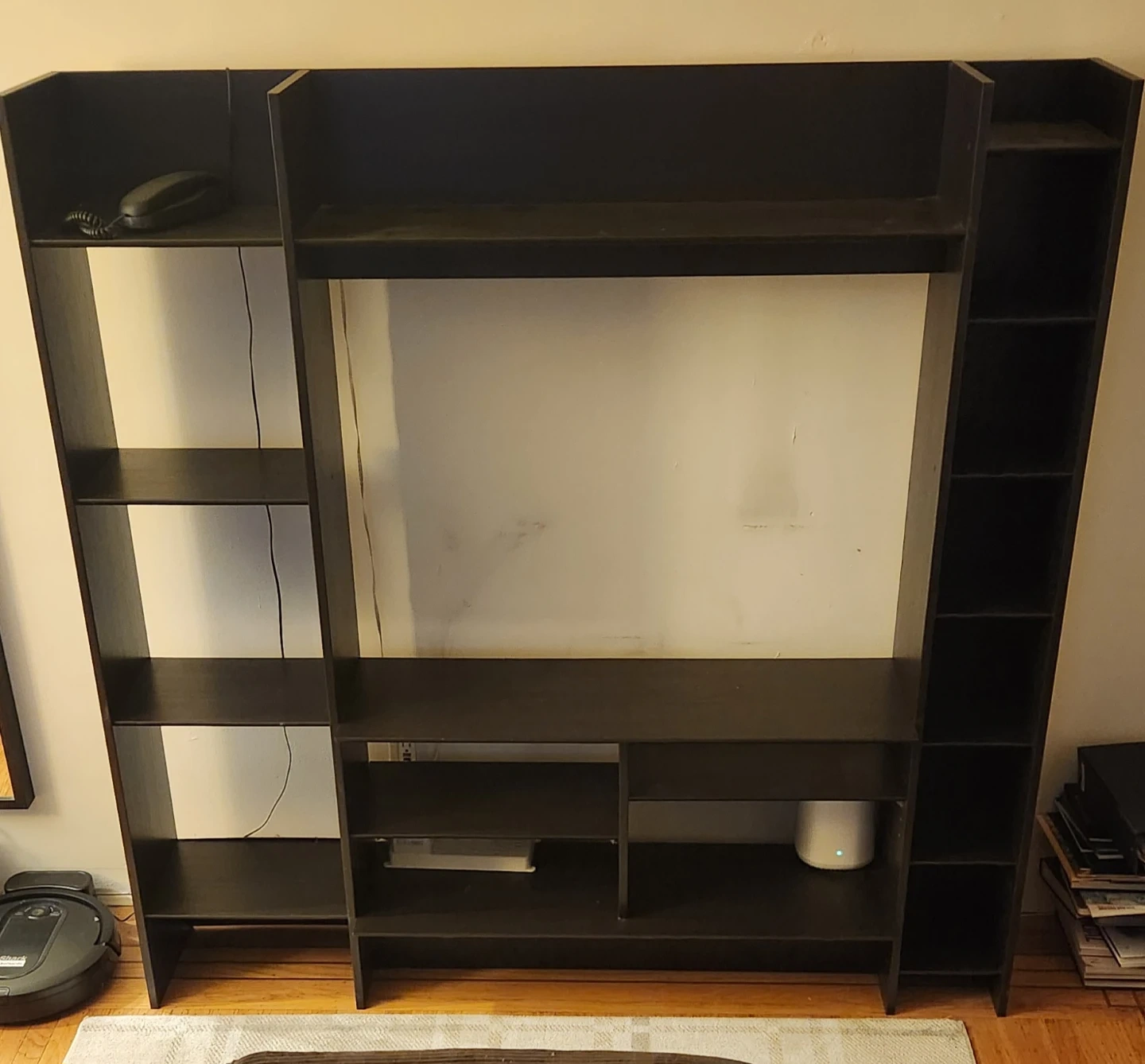 This spacious entertainment unit is a dark brown colour and features multiple shelves for storage. It includes a large central open space, ideal for a TV, with additional shelving on the sides and bottom. It's a great storage solution for media and decor!