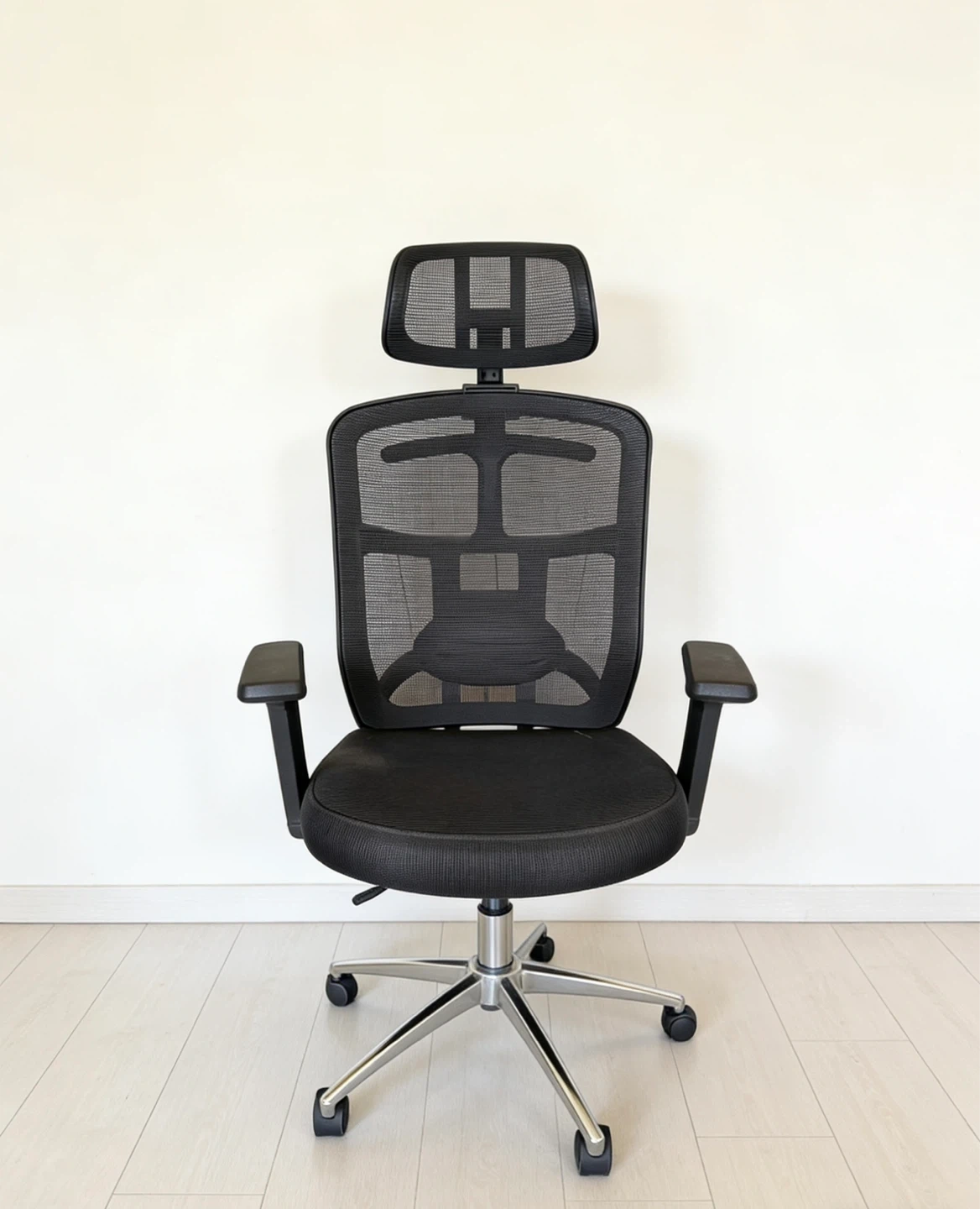 Black ergonomic mesh office chair with adjustable headrest and armrests. It features a padded seat and a five-star base with wheels for easy mobility. Mesh back provides breathability.