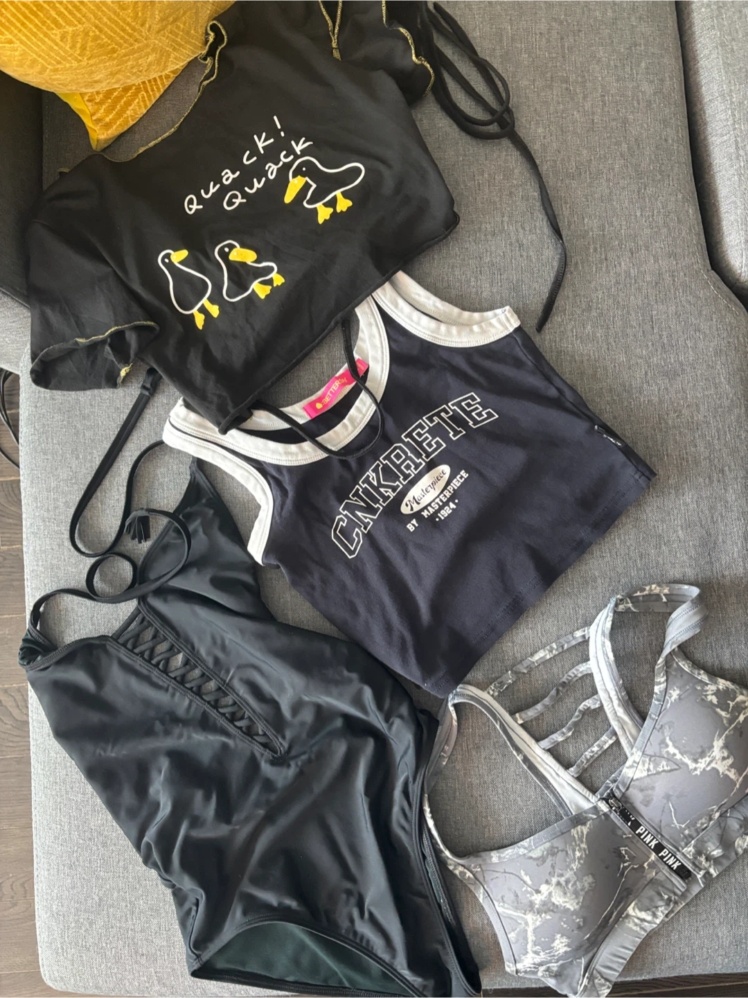 This bundle includes a black crop top with a duck graphic, a black tank top with 'CNKETE' text, a black one-piece swimsuit, and a grey marble print sports bra. The sports bra is from Pink. Perfect for a mix of casual wear and active styles!