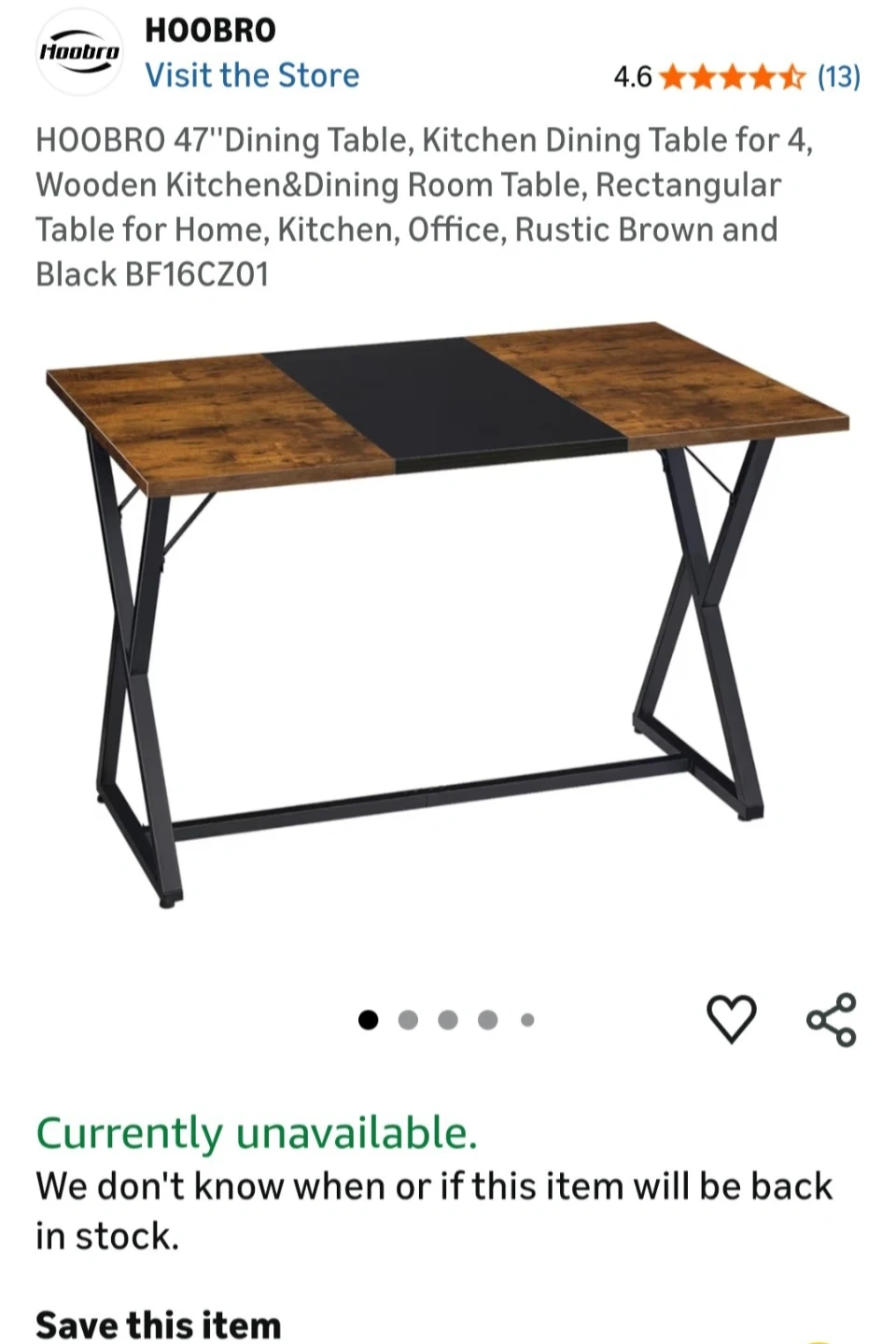 This is a HOOBRO 47" dining table designed for 4 people. It's a rectangular table with a rustic brown wood and black finish. Perfect for a kitchen or dining room!