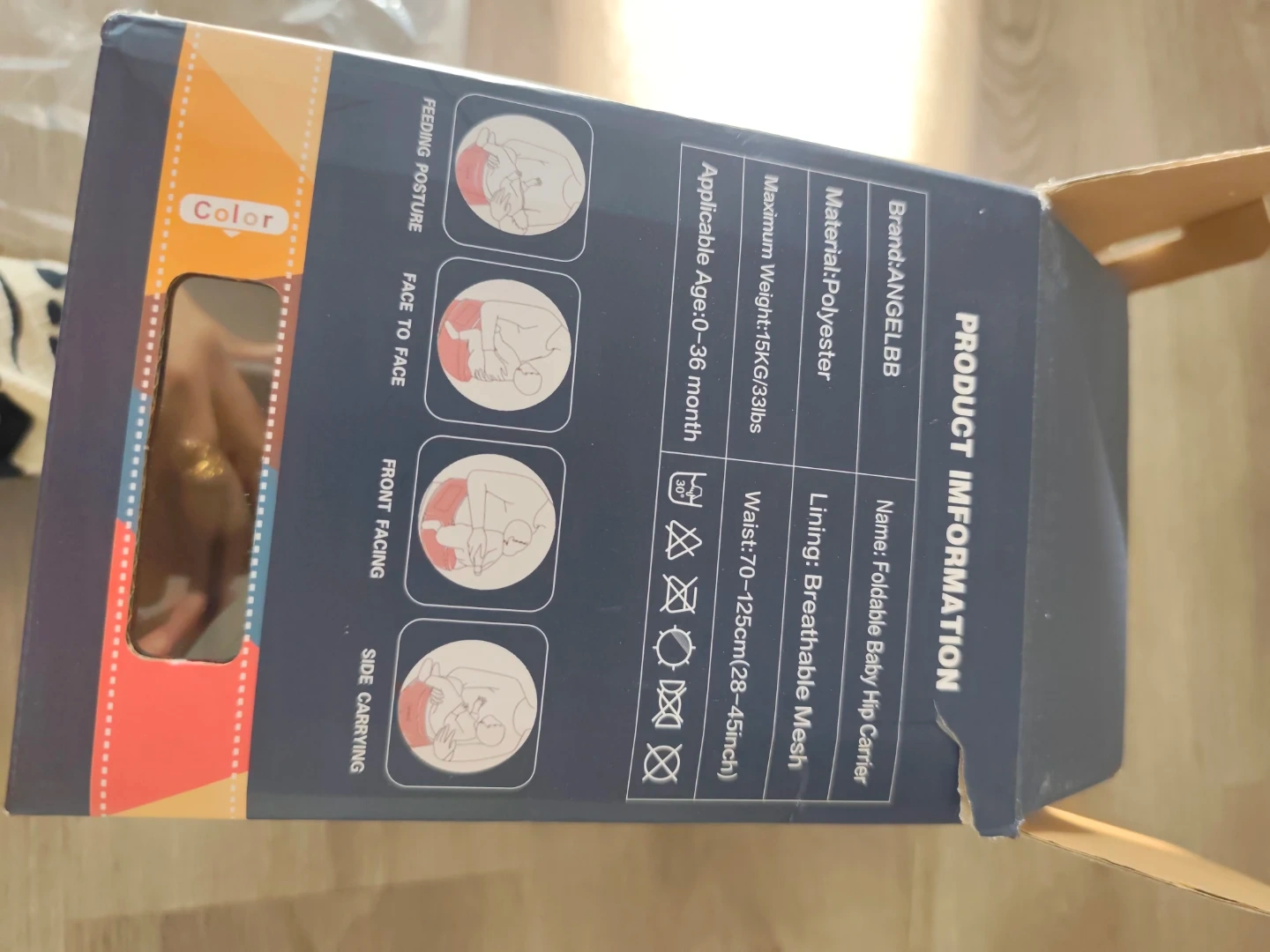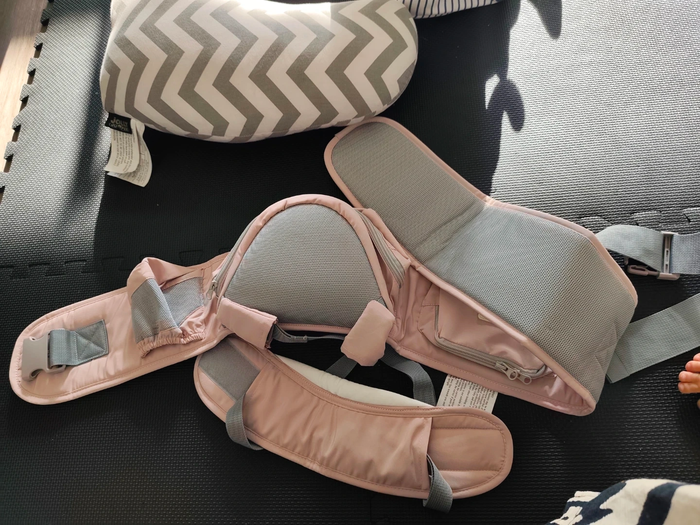 Selling a foldable baby hip carrier by Angelbb. It's in great condition and comes with the original box! The carrier is pink and made of polyester with breathable mesh lining. It's designed for babies aged 0-36 months and can hold a maximum weight of 15KG/33lbs. The waist size is adjustable from 70-125cm (28-45 inches).