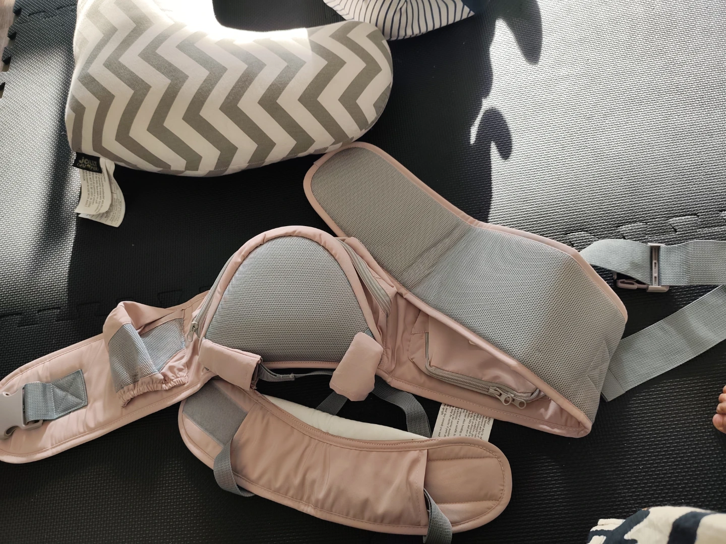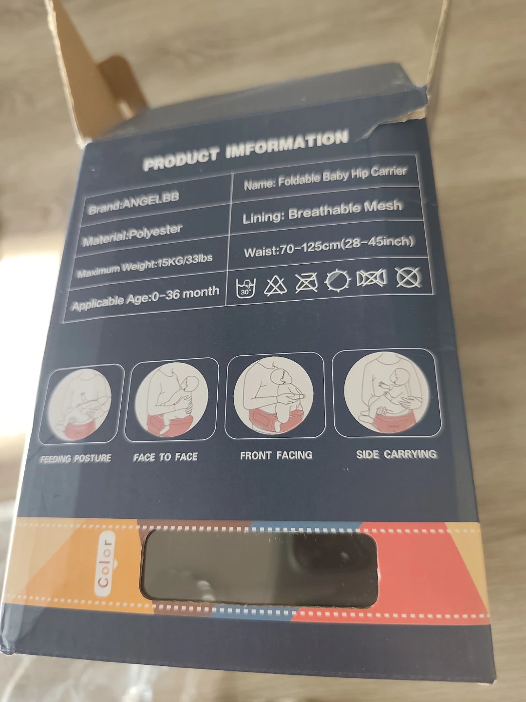 Selling a foldable baby hip carrier by Angelbb. It's in great condition and comes with the original box! The carrier is pink and made of polyester with breathable mesh lining. It's designed for babies aged 0-36 months and can hold a maximum weight of 15KG/33lbs. The waist size is adjustable from 70-125cm (28-45 inches).