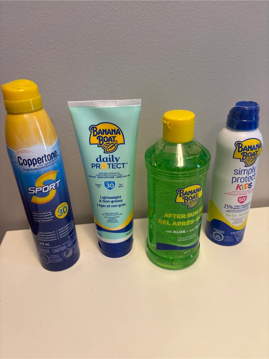 Selling a sunscreen lot including Coppertone Sport SPF 30 (222 mL), Banana Boat Daily Protect SPF 30, Banana Boat After Sun Gel with Aloe (480ml), and Banana Boat Simply Protect Kids SPF 50. Perfect for staying protected in the sun!