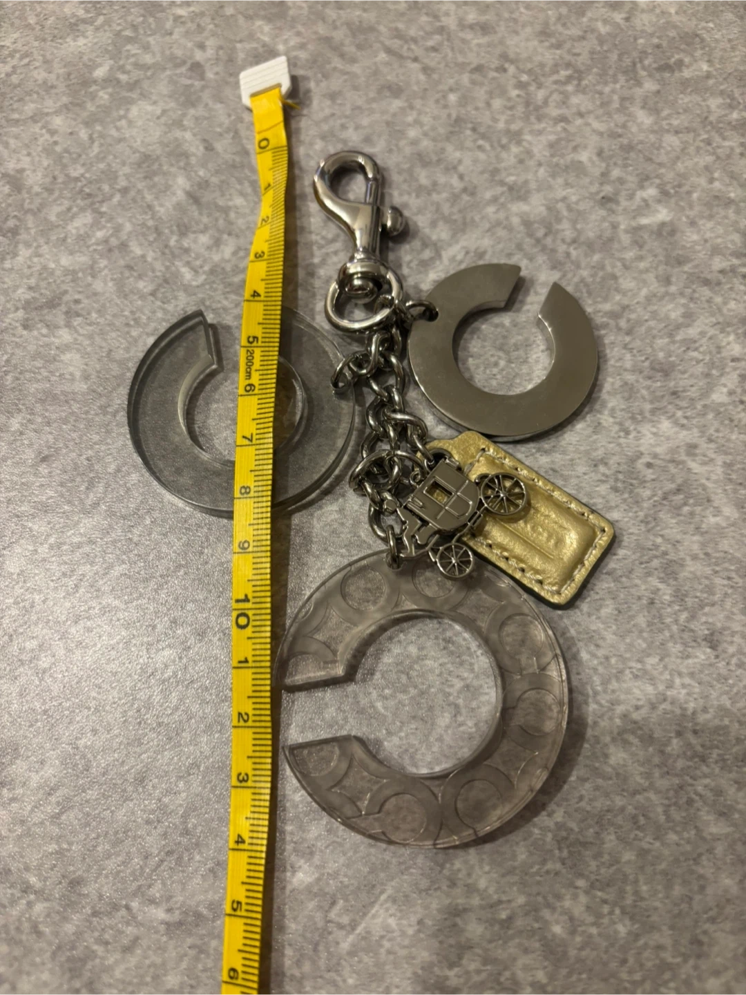 Coach keychain featuring a silver-tone clip and chain. It includes three "C" shaped charms, one made of clear plastic with the Coach logo embossed, another of brushed silver metal, and a small carriage charm. A gold-toned leather tag is also attached.