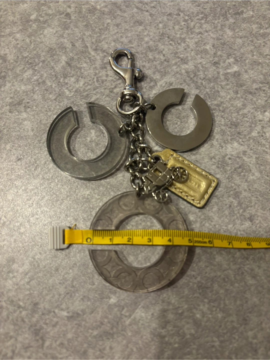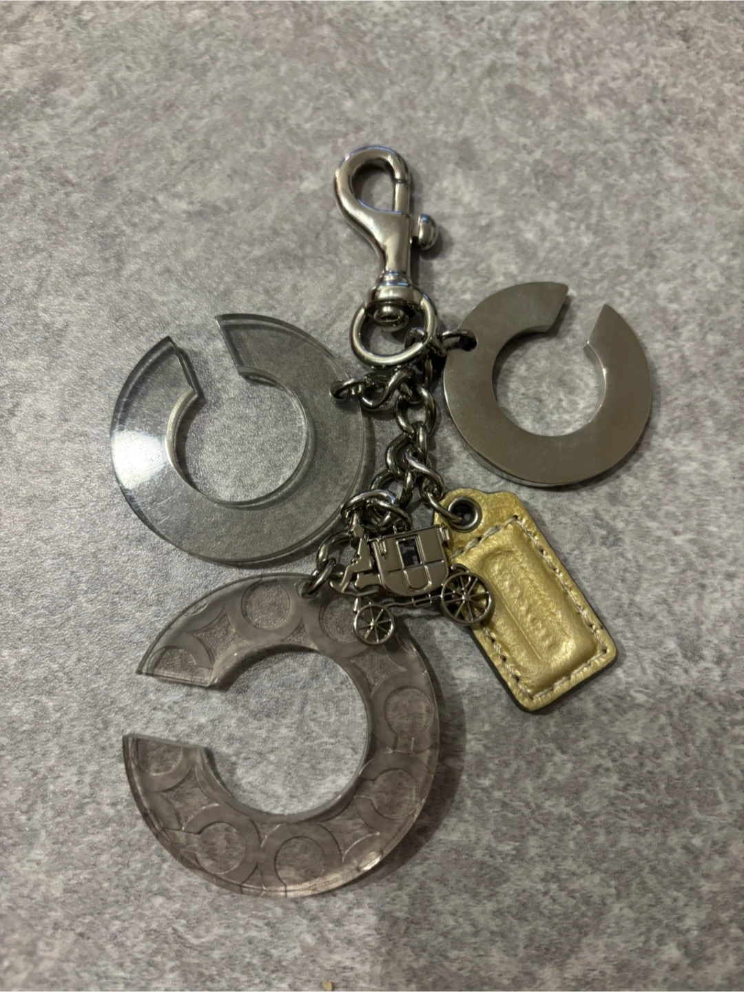 Coach keychain featuring a silver-tone clip and chain. It includes three "C" shaped charms, one made of clear plastic with the Coach logo embossed, another of brushed silver metal, and a small carriage charm. A gold-toned leather tag is also attached.