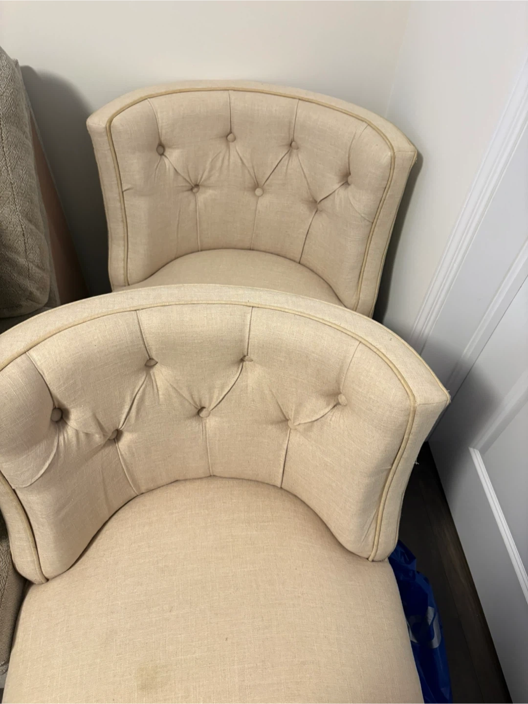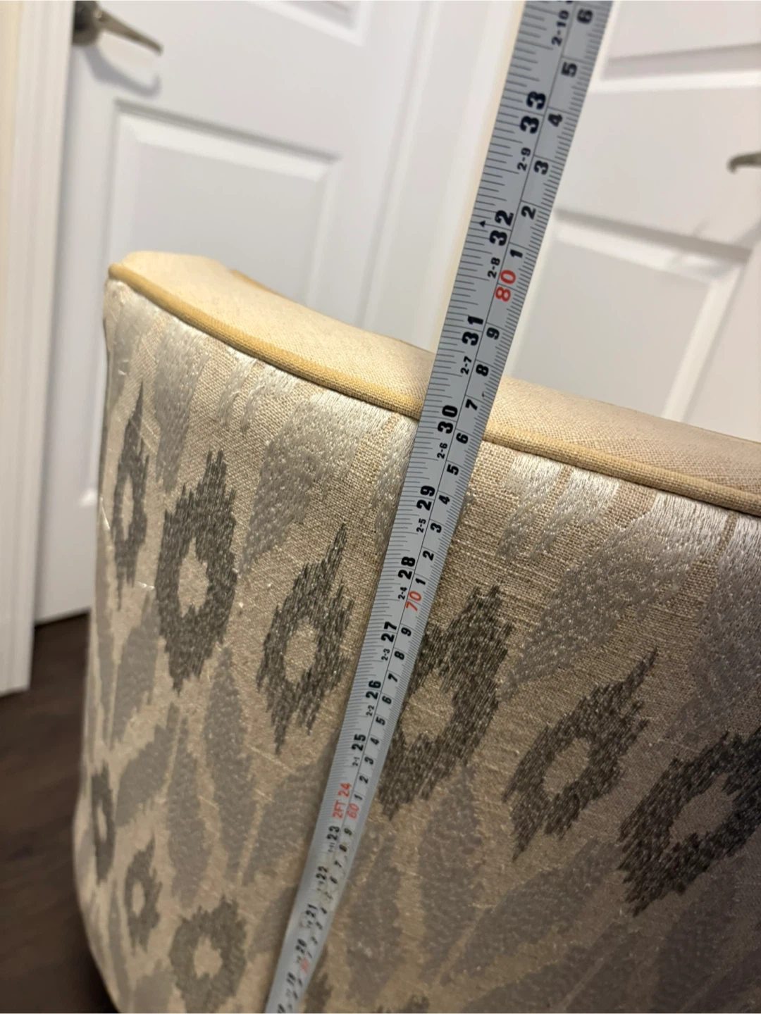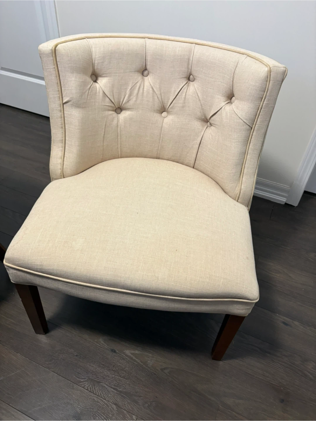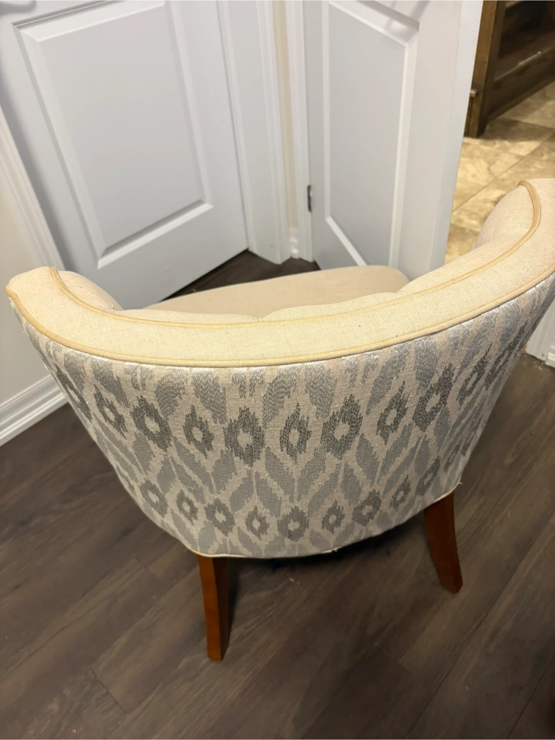 Selling a pair of lovely upholstered accent chairs. It's in great shape and would look great in any room! The chair is beige with a patterned back. It measures approximately 33 inches in height.