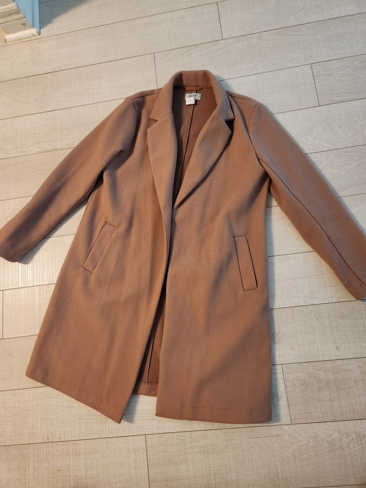 Selling a Suzy Shier coat in size S/P. It's made of 80% polyester and 20% viscose. A stylish addition to any wardrobe!