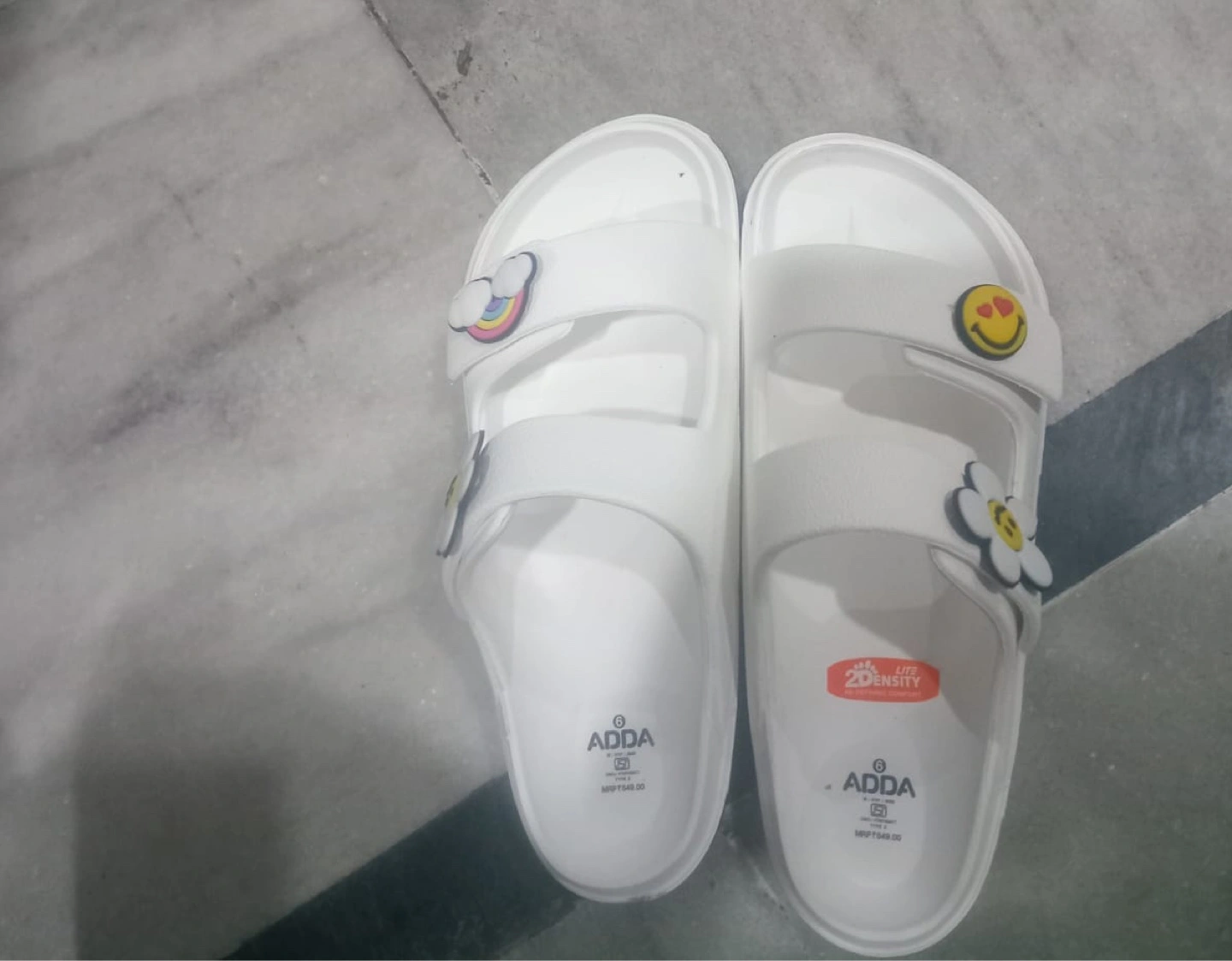These Adda slides are super cute and comfy! They're white and have adorable smiley face and rainbow charms on the straps. Perfect for adding a bit of fun to your everyday look