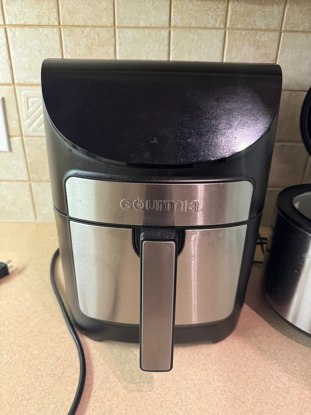 This Gourmia air fryer is in good working condition. It's black and stainless steel with a removable basket for easy cleaning. This appliance is great for making crispy snacks and meals quickly.