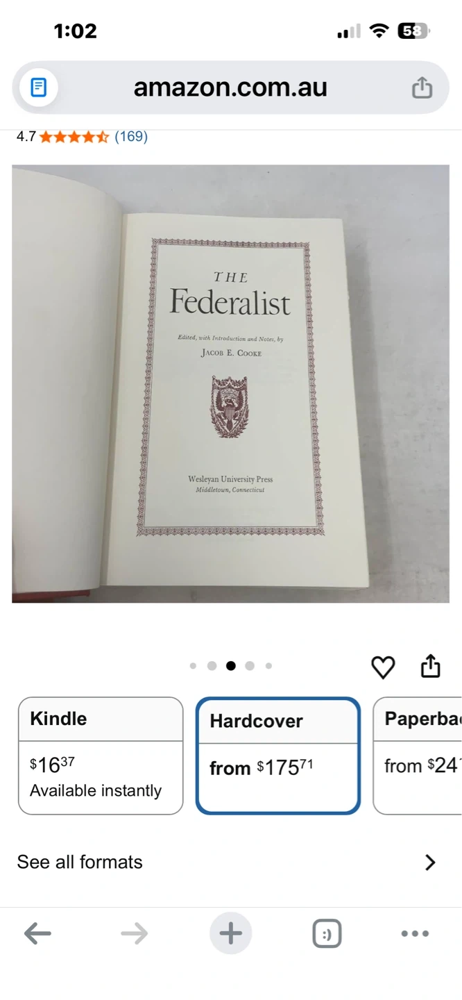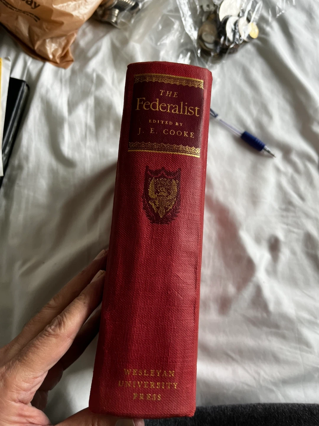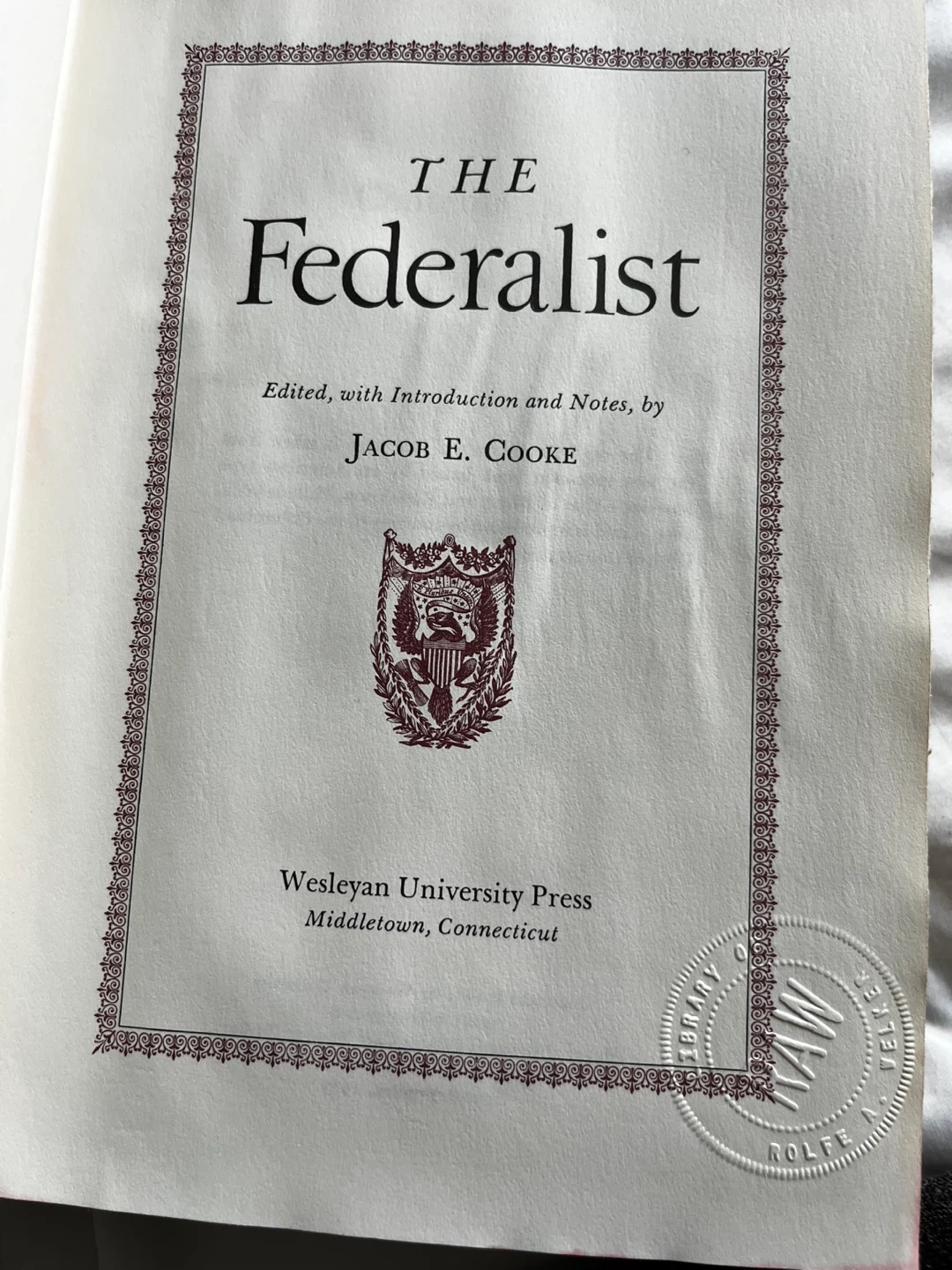 This is a hardcover edition of The Federalist Papers, edited with introduction and notes by Jacob E. Cooke. Published by Wesleyan University Press. A foundational text for understanding American political thought.