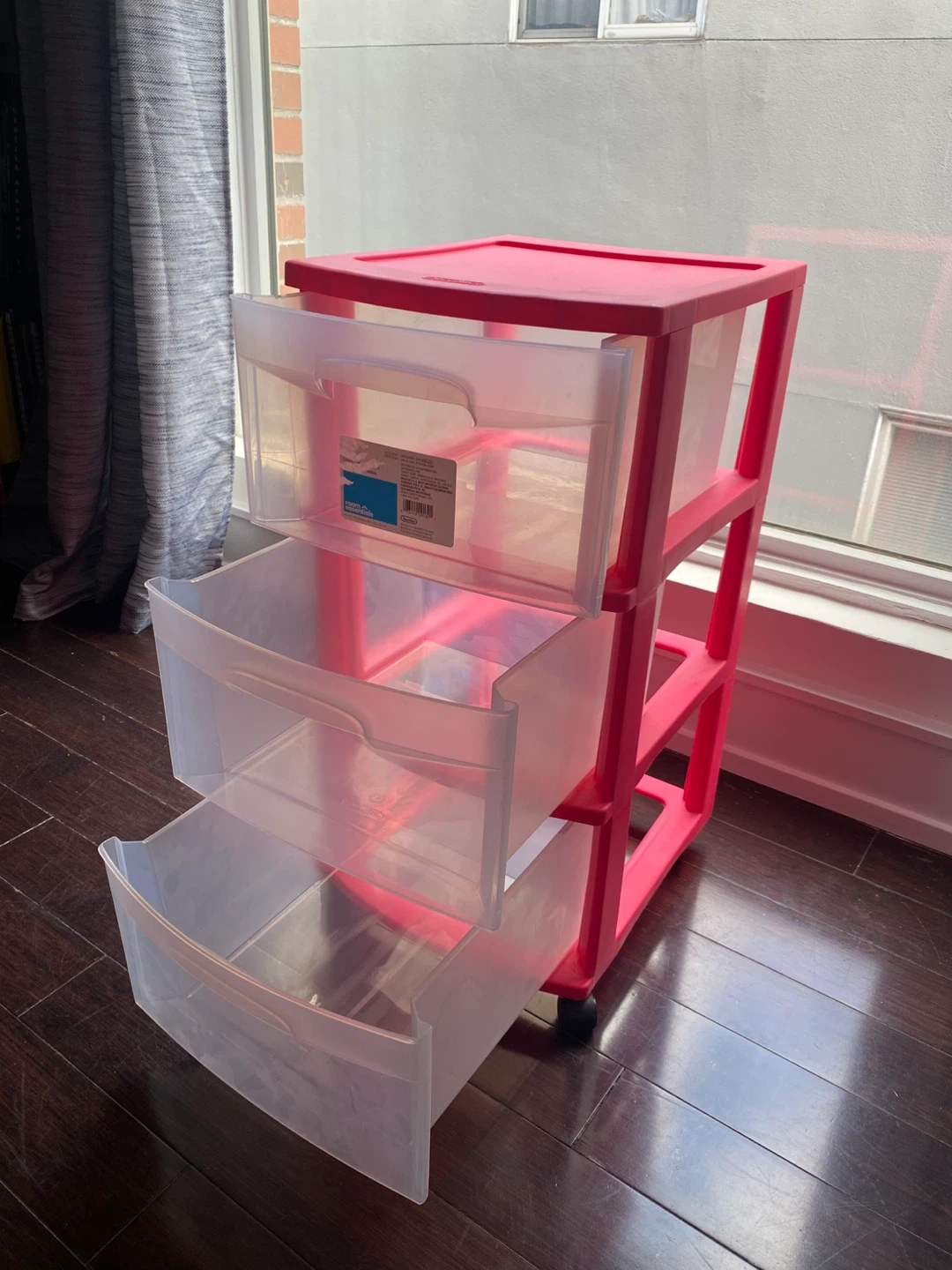 This plastic storage cart comes with three clear drawers. It has a red frame and a red top. The drawers are easy to slide in and out. Its compact size makes it great for small spaces.